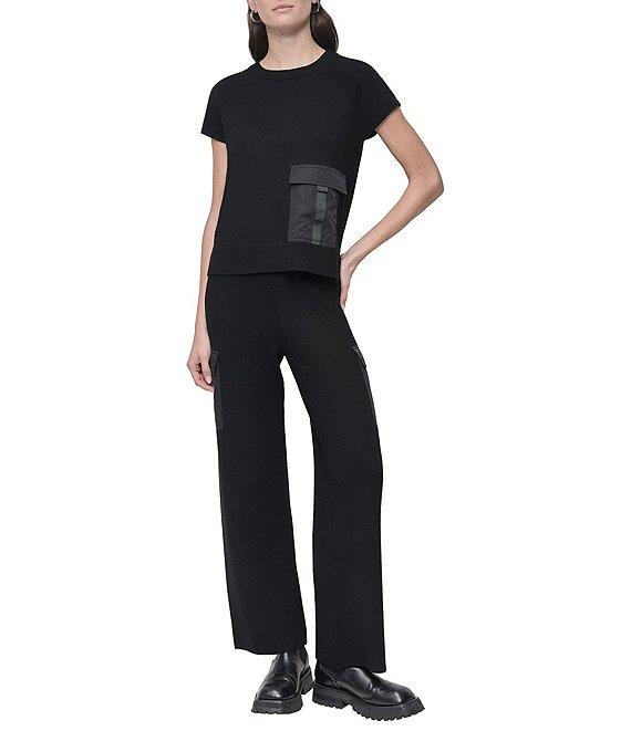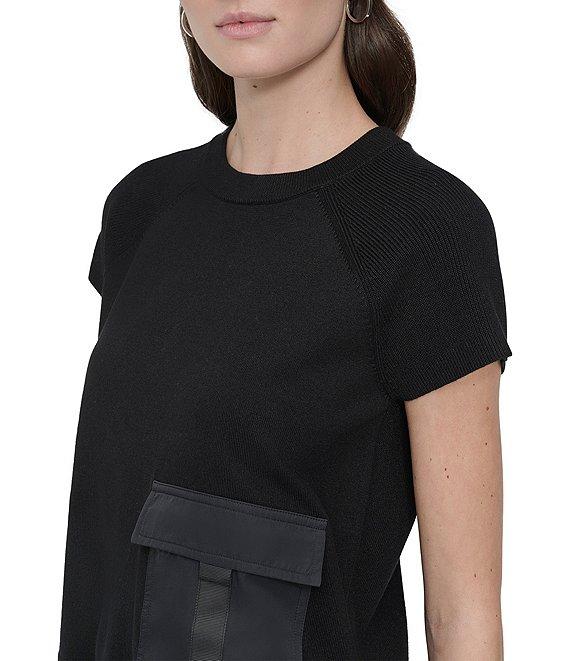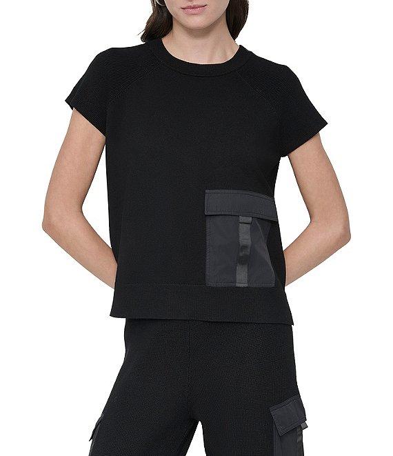 From DKNY by Donna Karan, this top features: Mixed media fabrication Crew neckline Short sleeves One front satin cargo pocket Pullover construction Shell: viscose rayon/nylon; pocket: polyester Hand wash cold; line dry; cool iron if needed Imported.