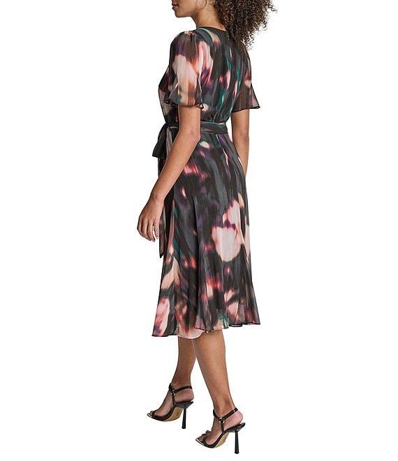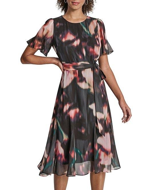 From DKNY by Donna Karan Petite, this dress features: Chiffon fabrication Round neckline Short sleeves Fit and flare silhouette Midi dress Removable belt Floral print Lined Center back zipper closure Approx. 44.75" in length Polyester Dry clean Imported.
