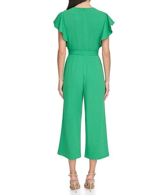 From DKNY by Donna Karan Petite, this jumpsuit features: Crepe jersey fabrication Jumpsuit silhouette Crew neckline with keyhole Short flutter sleeves Self tie belt at waist Cropped leg Center back zipper closure Approx. 22" inseam Polyester/spandex Dry clean Imported.