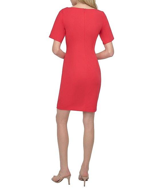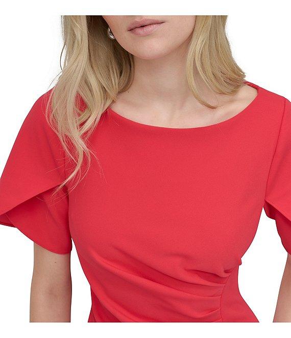 From DKNY by Donna Karan Petite, this dress features: Scuba crepe fabrication Sheath dress silhouette Boat neckline Short tulip sleeves Ruched waist Center back zipper closure Approx. 34" length Polyester/spandex Dry clean Imported.