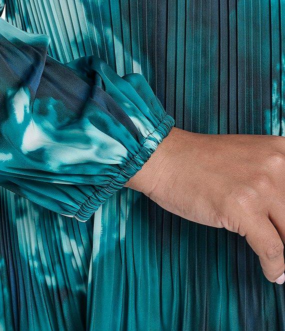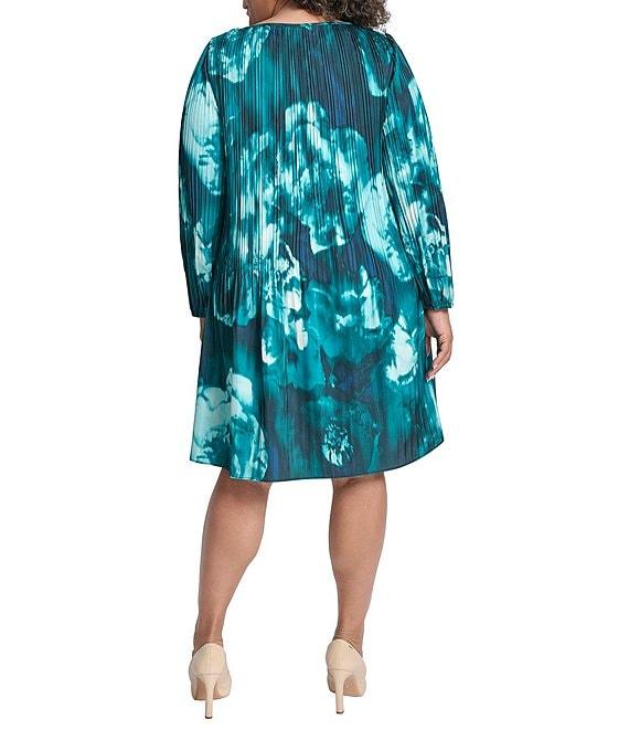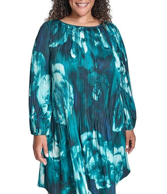 DKNY by Donna Karan Plus Size Printed Charmeuse Round Neck Long Sleeve Pleated Shift Dress