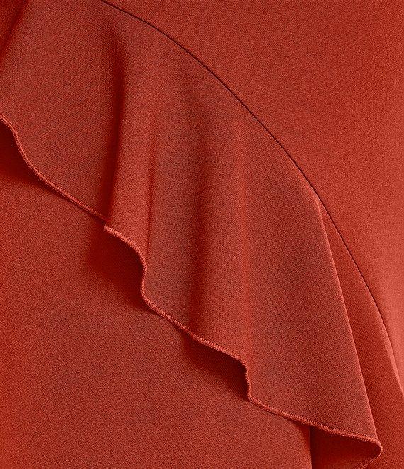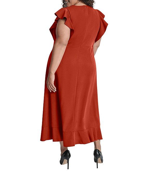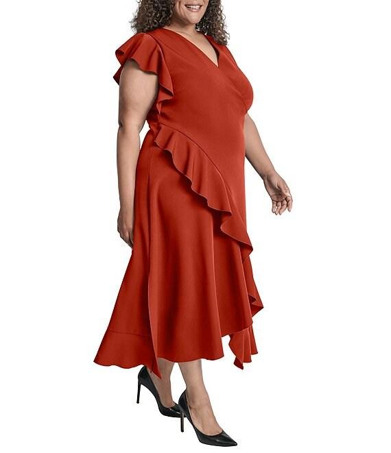 From DKNY by Donna Karan Plus, this dress features: Salon stretch fabrication Surplice neckline Cap sleeves Ruffle sleeves Ruffles on bodice Midi dress Lined Center back zipper closure Approx. 50.5" in length Polyester/spandex Dry clean Imported.