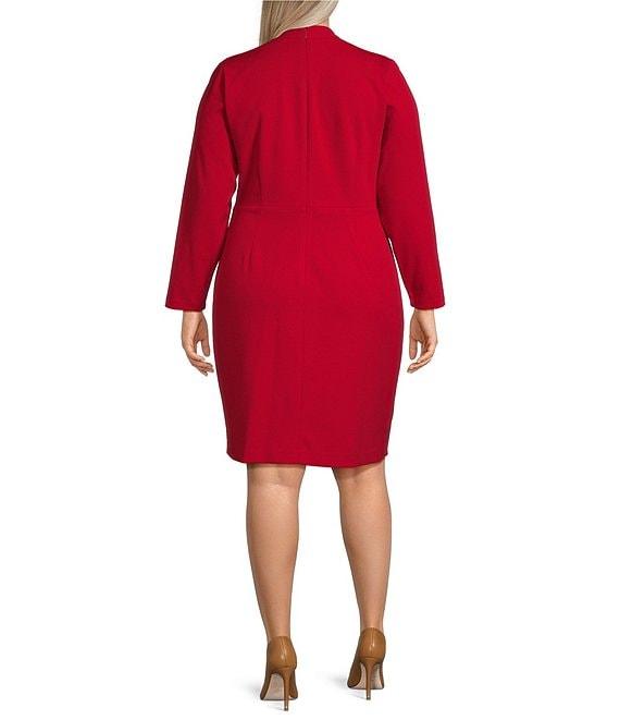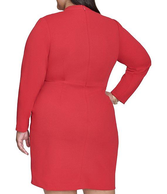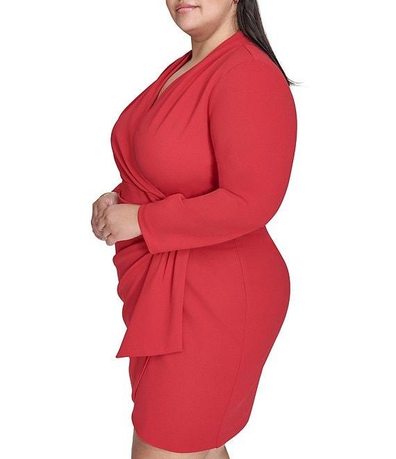 From DKNY by Donna Karan Plus, this dress features: Faux wrap silhouette V-neck Long sleeves Lined Side tie Zipper back closure Approx. 38.5" in length Polyester/spandex Dry clean Imported.