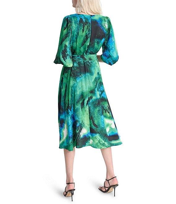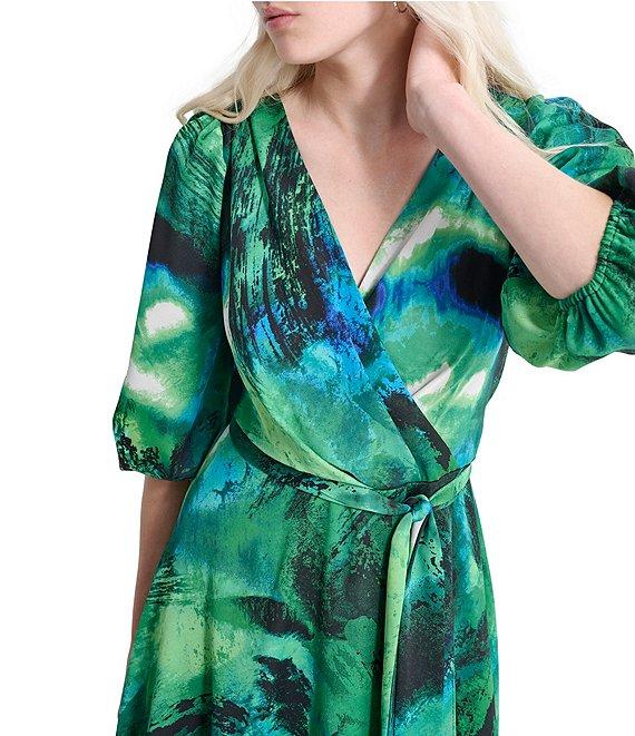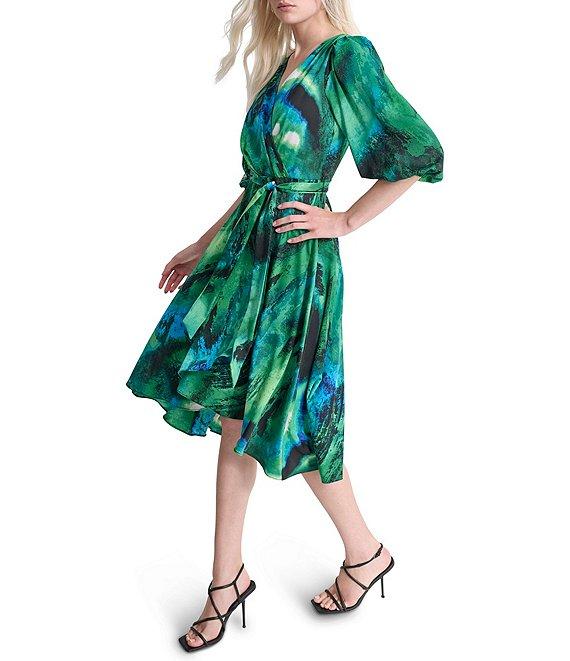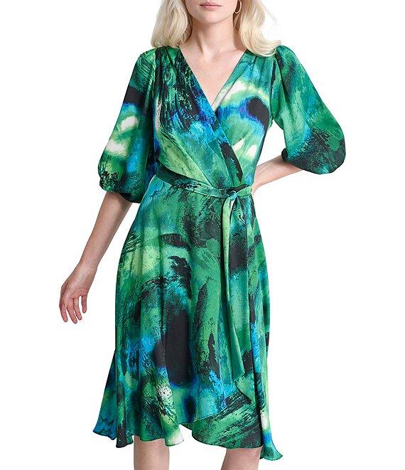 From DKNY by Donna Karan, this dress features: Woven fabrication Faux wrap silhouette Surplice v-neckline 3/4 balloon sleeves Belted Fully lined Flutter hemline Center back hook & eye/zip closure Approx. 45" length Polyester Dry clean Imported.