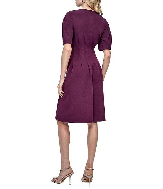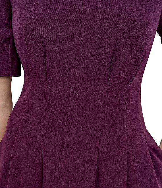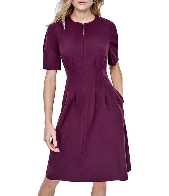 From DKNY by Donna Karan, this dress features: Salon stretch fabrication Zip neck Short sleeve Cinched waist Fit and flare silhouette 2 side seam pockets Knee length Center back zipper closure Approx. 40" in length Polyester/spandex Dry clean Imported.