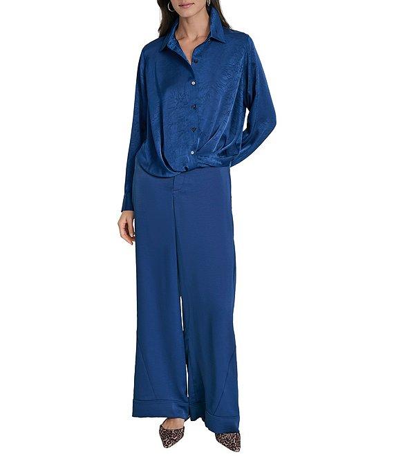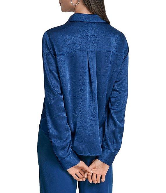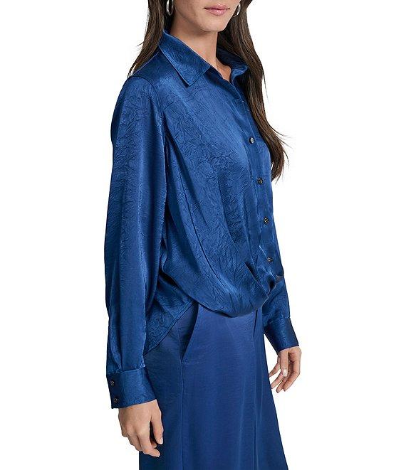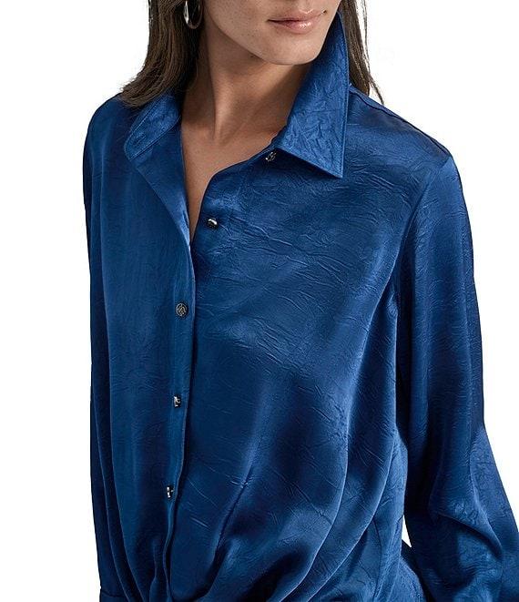 From DKNY By Donna Karan, this blouse features: Satin crease fabrication Point collar Long sleeves Twist front detail Button front closure Approx. 22.5" length Polyester Hand wash Imported.