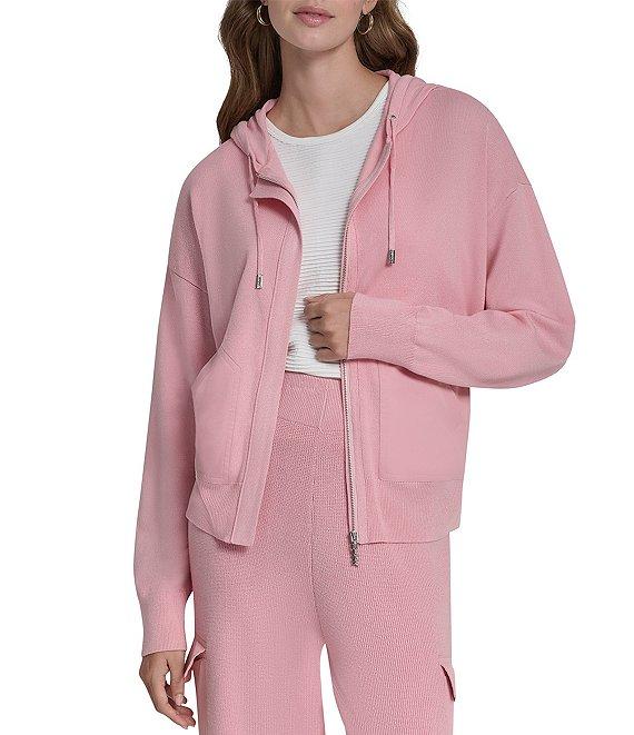 From DKNY by Donna Karan, this jacket features: Drawstring hood Open-front neckline Drop shoulder long sleeves Satin front pockets Straight hemline Full front zipper closure Shell: viscose rayon/nylon; pocket: 100% polyester Hand wash cold with like colors; dry flat; cool iron if needed Do not dry clean Imported.