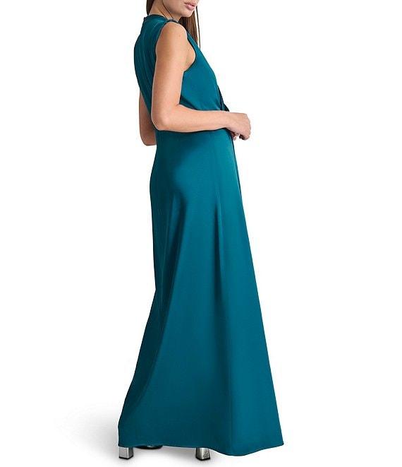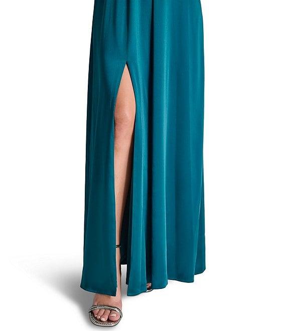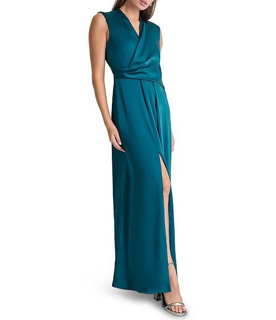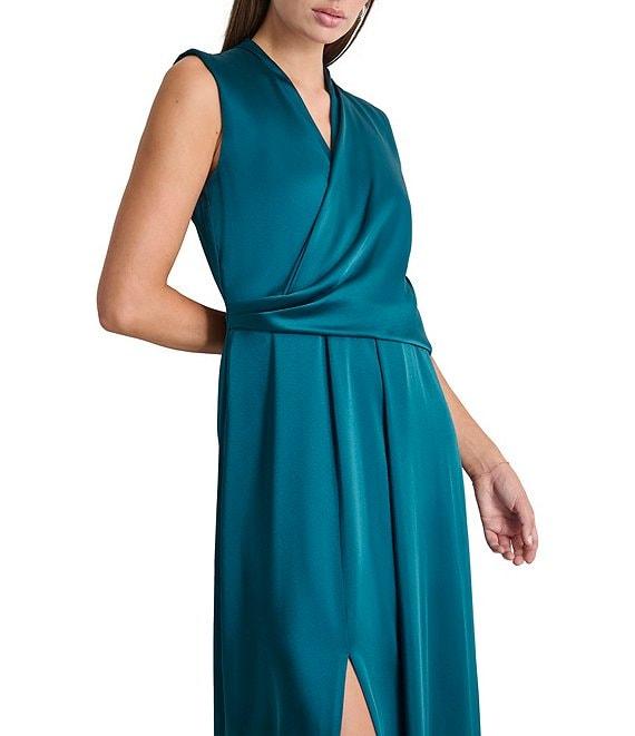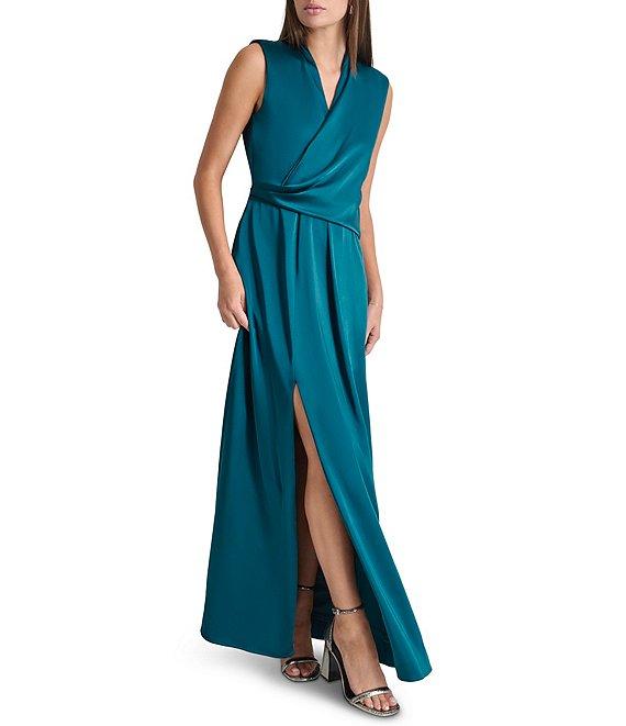 DKNY by Donna Karan Satin Surplice Neck Sleeveless Twist Front Fit And Flare Gown