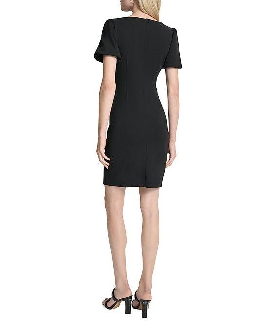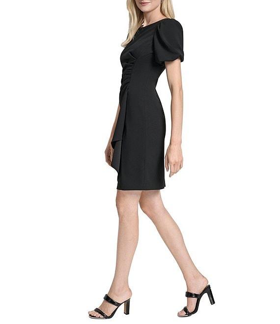 From DKNY by Donna Karan, this dress features: Scuba crepe fabrication Round neckline Short bubble sleeves Sheath silhouette Short ruched bodice Ruffle front Center back zipper closure Approx. 36.5" in length Polyester/spandex Dry clean Imported.