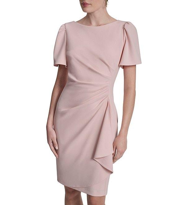 From DKNY by Donna Karan, this dress features: Scuba crepe fabrication Sheath silhouette Crew neckline Short sleeves Side ruching Zip back closure Approx. 36.5" length Polyester/spandex Dry clean Imported.