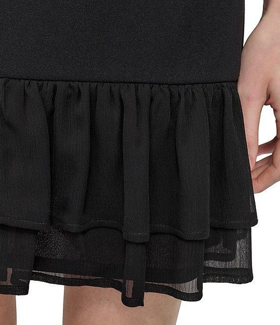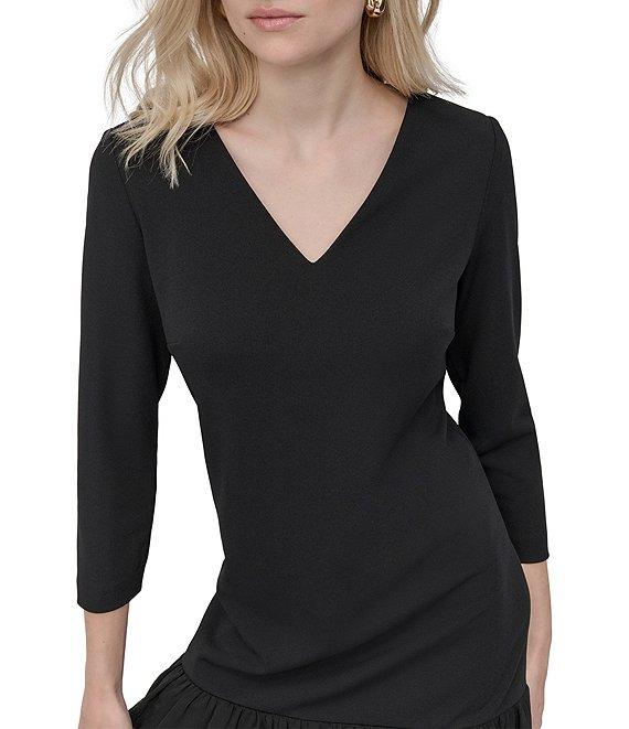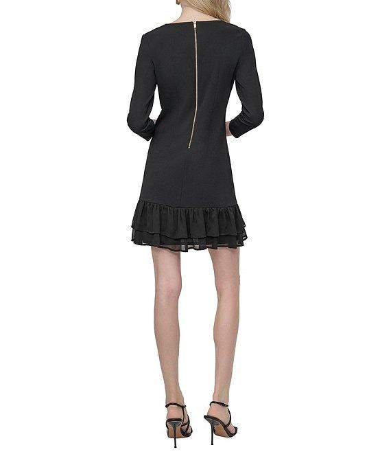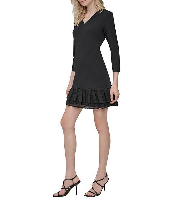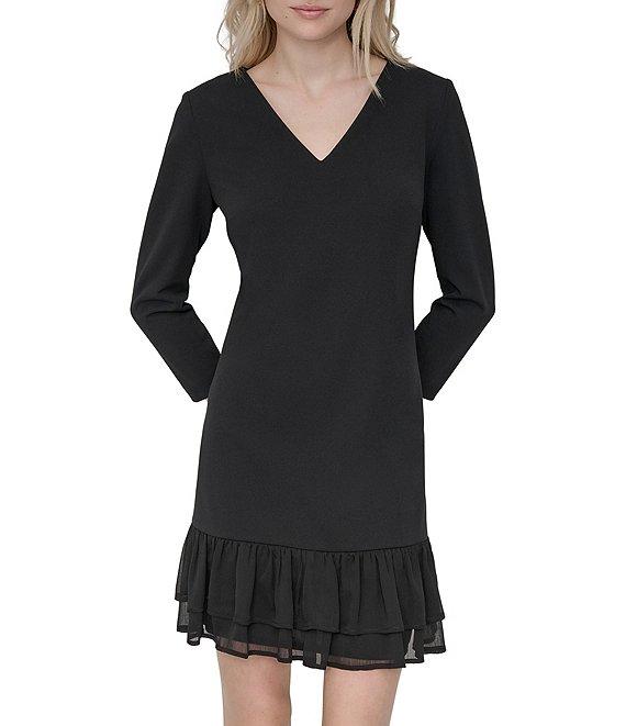From DKNY by Donna Karan, this dress features: Scuba crepe fabrication V-neckline Long sleeves Ruffle hem Exposed zipper Above the knee Sheath silhouette Center back zipper closure Approx. 35.25" in length Polyester/spandex Dry clean Imported.