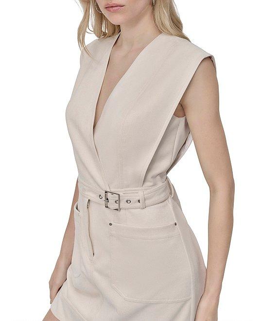 From DKNY by Donna Karan, this dress features: Scuba suede fabrication Surplice neckline Sleeveless Sheath silhouette Two front pockets Above the knee length Lined Center front snap Center front zipper Internal button Approx. 35.5" in length Polyester/spandex Dry clean Imported.