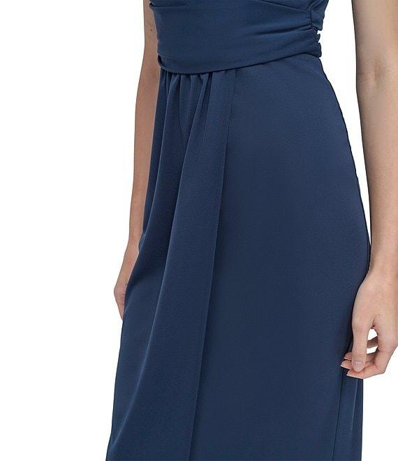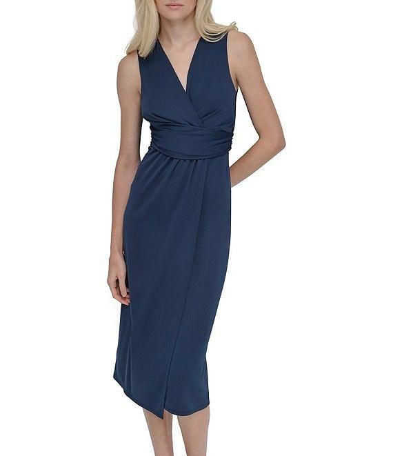 From DKNY by Donna Karan, this dress features:Jersey fabricationV-necklineSleevelessSheath silhouetteFaux wrap ruched bodiceZip back closureApprox. 44" in center back lengthPolyesterDry cleanImported.