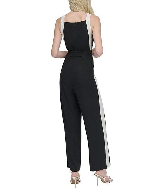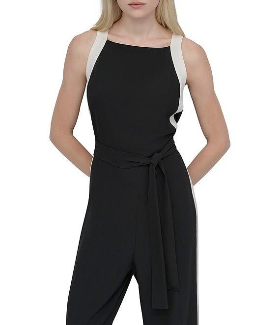 From DKNY by Donna Karan, this jumpsuit features:Twill fabricationSquare necklineSleevelessLinedRemovable beltColor block detailsZip back closureApprox. 30" inseamPolyesterDry cleanImported.