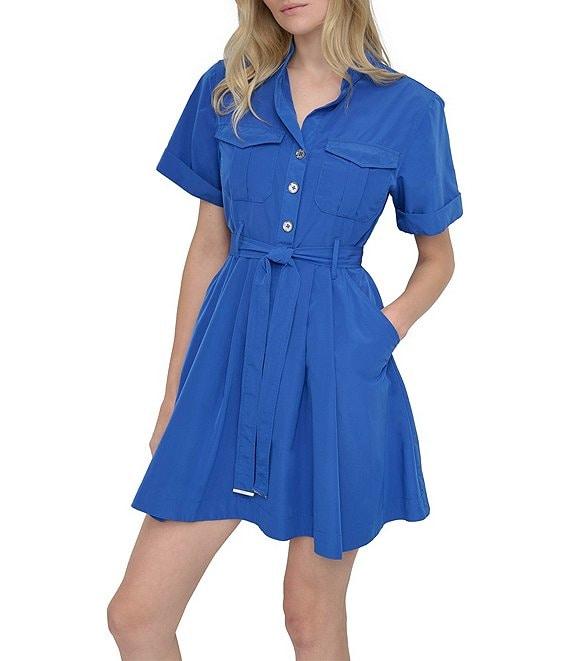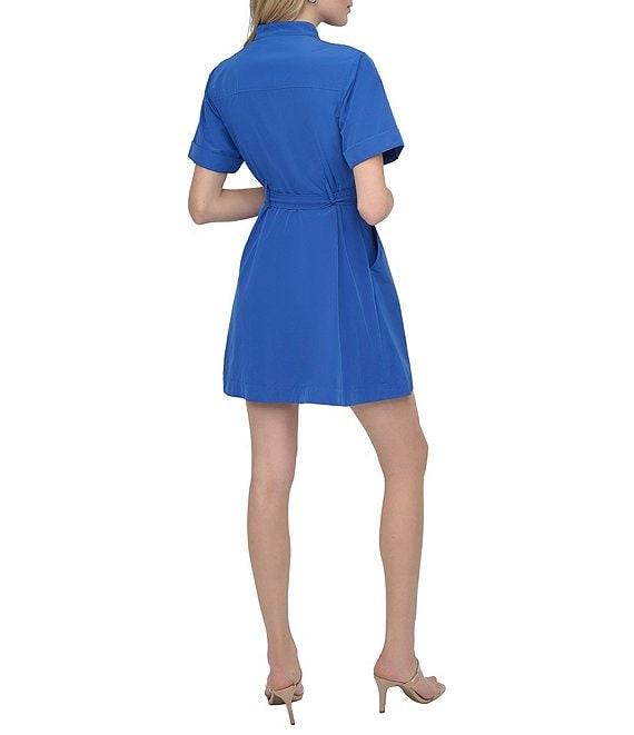 From DKNY by Donna Karan, this dress features:Tech taffeta fabricationShirt dress silhouettePoint collar necklineShort sleeves2 front chest pockets, 2 side pocketsRemoveable beltButton front closureApprox. 34.5" lengthPolyester/nylonDry cleanImported.