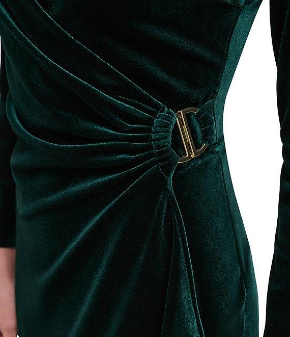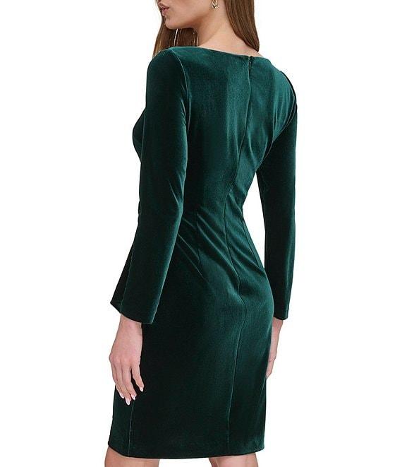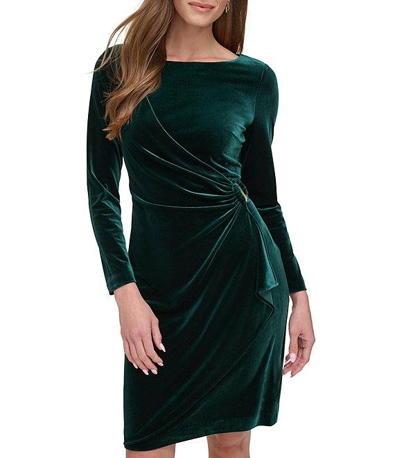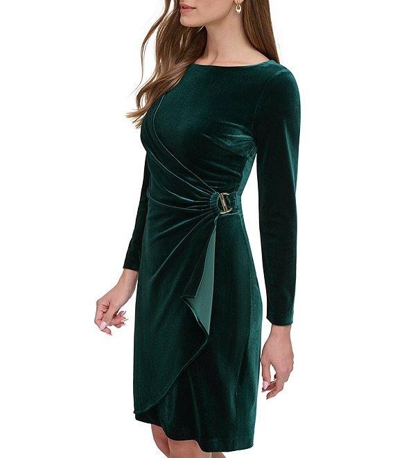 From DKNY by Donna Karan, this dress features: Velvet fabrication Jewel neckline Long sleeve Faux wrap silhouette D-buckle hardware Ruched bodice Above the knee Center back zipper closure Approx. 36.75" in length Polyester Dry clean Imported.