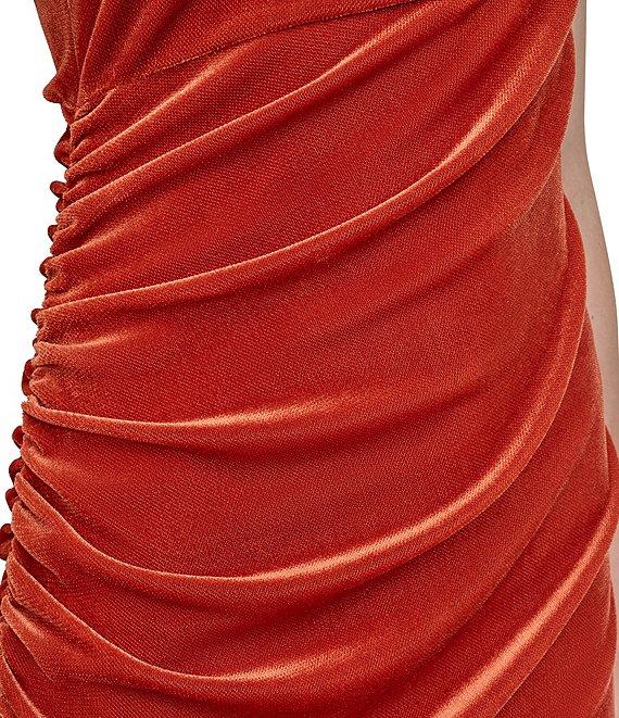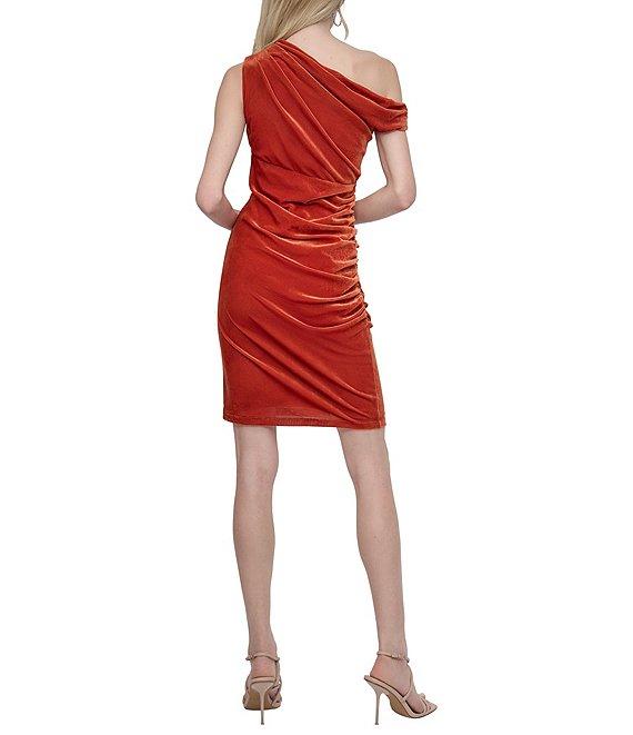 From DKNY by Donna Karan, this dress features: Velvet mesh fabrication Asymmetrical neckline One side off the shoulder Ruched bodice Fitted silhouette Above the knee Lined Pull on construction Approx. 38" in length Polyester/spandex Dry clean Imported.