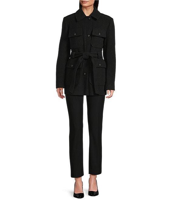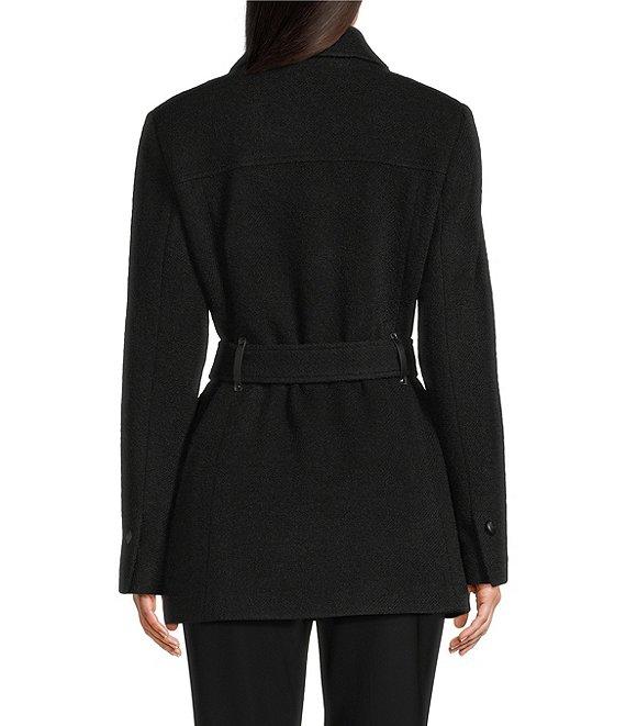 From DKNY by Donna Karan, this coat features: Wool blend fabrication Single breasted silhouette Point collar neckline Long sleeves Two chest pocket Two front pocket Belted Fitted fit Fully lined Straight hemline Button front closure Approx. 29" length Wool/polyester; lining: polyester Machine wash Imported.