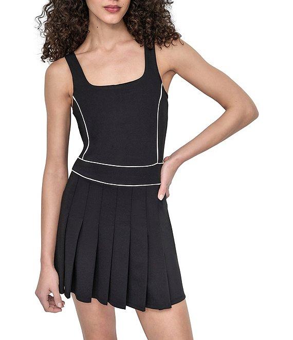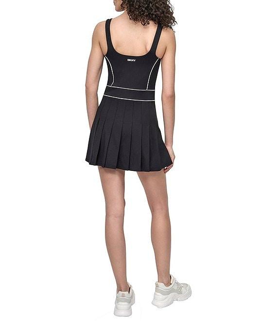 From DKNY Sport by Donna Karan, this dress features: Square neckline Sleeveless Contrast piping Pleated skirt Built in bike short Bra with removable cups Bike short pockets Pull on construction Approx.31" length Approx. 3.25" inseam Polyester/spandex Machine wash Imported.