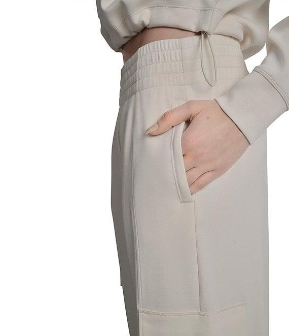 From DKNY Sport by Donna Karen, these pants feature: Highline scuba fabrication Cargo style Side entry and cargo pockets Elastic waistband Pull on construction Approx. 30" inseam, 11.5" front rise, 16.25" back rise Polyester/viscose rayon/elastane spandex Machine wash Imported.