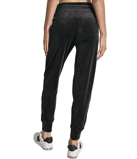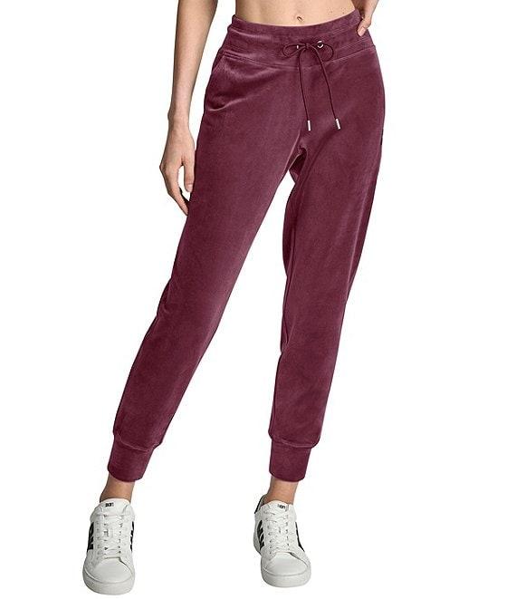 From DKNY Sport by Donna Karan, these joggers feature: Velour fabrication Mid-rise Elastic drawcord waistband Slim fit Side slit pockets Metallic DKNY patch Elastic cuff Pull-on construction Approx. 28" inseam; 10.5" front rise; 15.75" back Cotton/polyester Machine wash Imported.