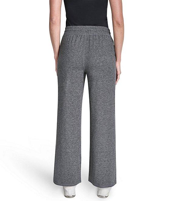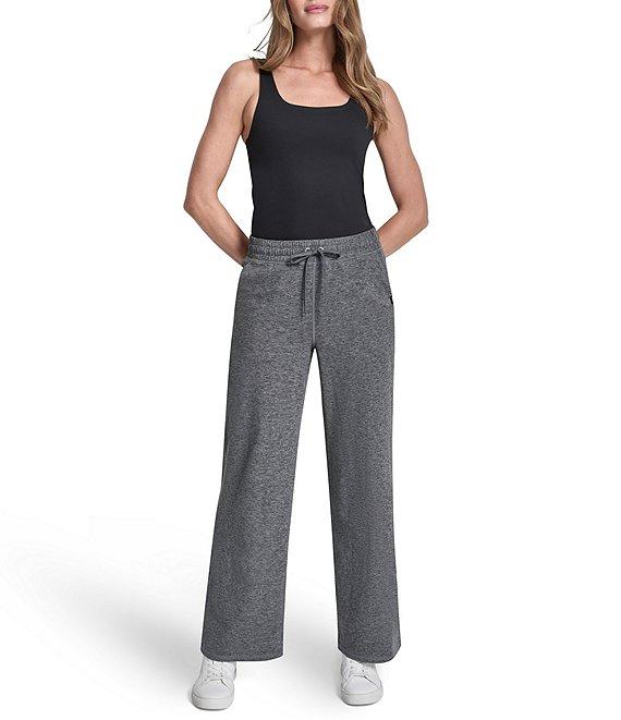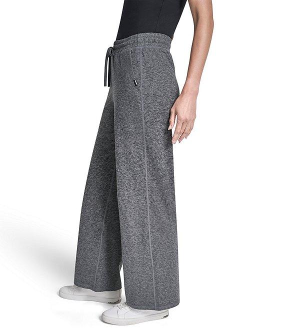 From DKNY Sport By Donna Karan, these pants feature: Moisture wicking peached spacedye jersey fabrication High waisted Wide leg silhouette Encased elastic and drawcord Front slant pockets Logo tab details on wearer's left pocket Logo metal grommets at center waistband Pull-on construction Approx. 30" inseam, 11.5" front rise, 15.125" back rise, 11.125" leg opening Polyester/spandex Machine wash cold Imported.