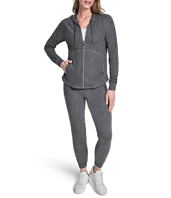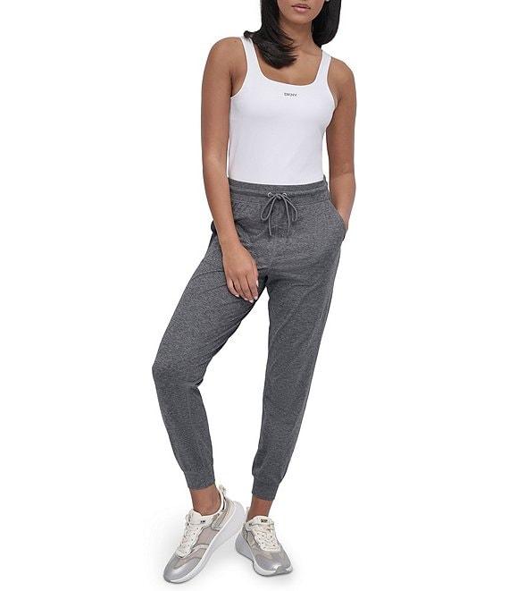 From DKNY Sport by Donna Karan, these joggers features: High waist Pull-on construction Pocket detail Drawstring detail Elastic waist detail Approx. 26" inseam, 10.5" front rise, 13.25" back rise Polyester/elastane spandex Machine wash Imported.