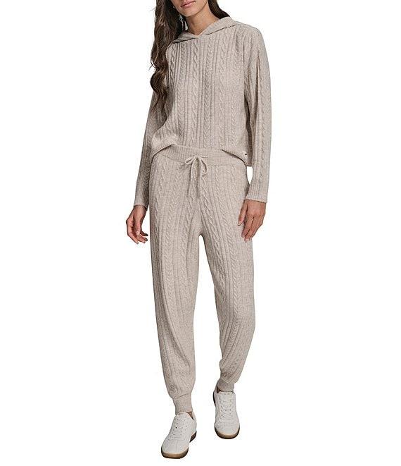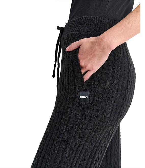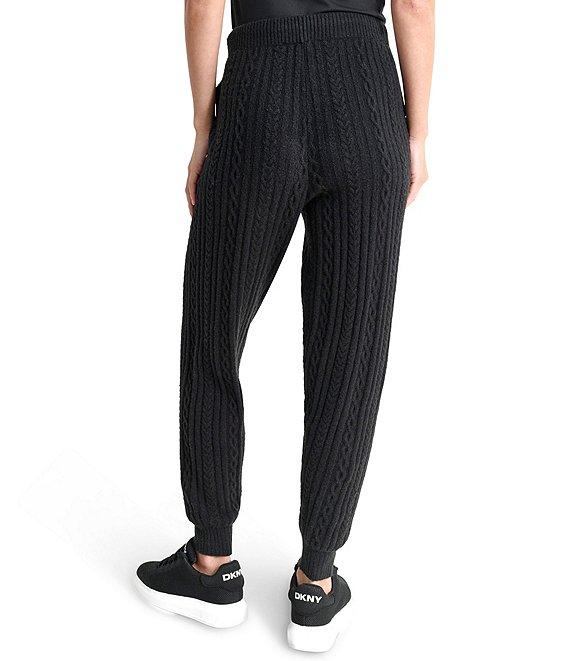 From DKNY Sport by Donna Karan, these joggers features: Cable knit fabrication High waisted Draw cord at waist Cuffed Side seam pockets Patch logo by left pocket Pull-on construction Approx. 28" inseam; 11.75" front rise; 15.5" back rise Acrylic/nylon/elastane spandex Hand wash inside out Imported.