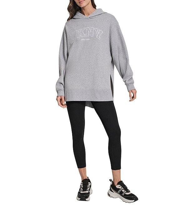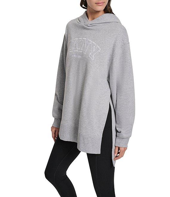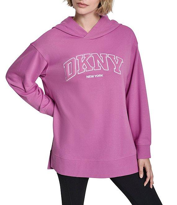 From DKNY Sport by Donna Karan, this hoodie features: French terry fabrication DKNY Varsity 3D puff applique logo Oversized fit Hooded Long sleeves Drop shoulders High-low hem with side slit Rib banded hemline Pullover construction Approx. 29" front, 31" back length Cotton/polyester Machine washable Imported.