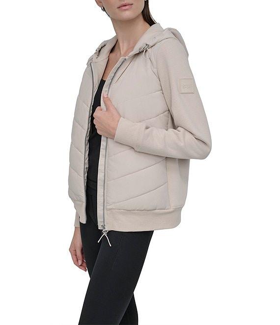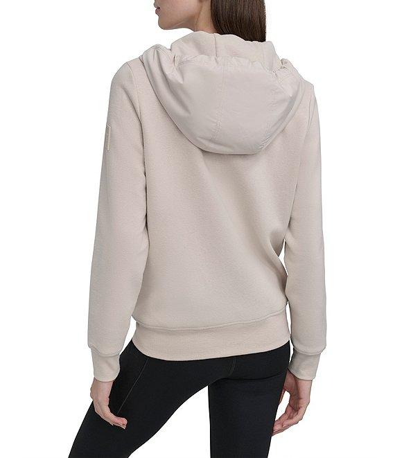 From DKNY Sport by Donna Karan, this jacket features: Matte stretch fabrication Hooded with bungee closure Long sleeves Side seam pockets Tonal silicone patch on left arm Straight hemline Center front zipper closure Approx. 25" length Cotton/polyester Machine wash Imported.