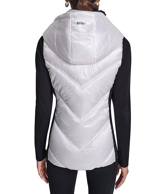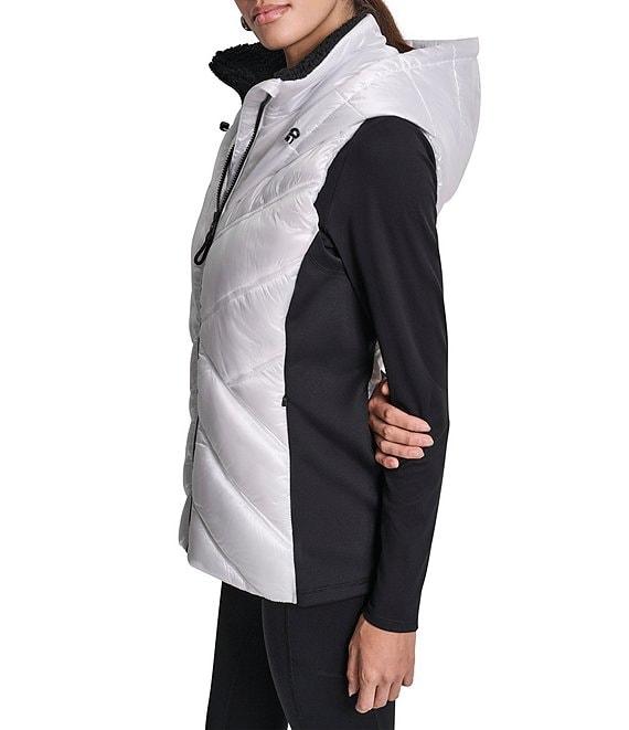 From DKNY Sport by Donna Karan, this vest features: Metallic cire woven fabrication Mock neckline with attached hoodie Sleeveless Sherpa lined Side seam pockets Side panel: scuba knit Bungee with logo grommets at hood Straight hemline Center front zipper closure Approx. 26.5" length Polyester/nylon; contrast: polyester/spandex Machine wash cold/tumble dry low Imported.