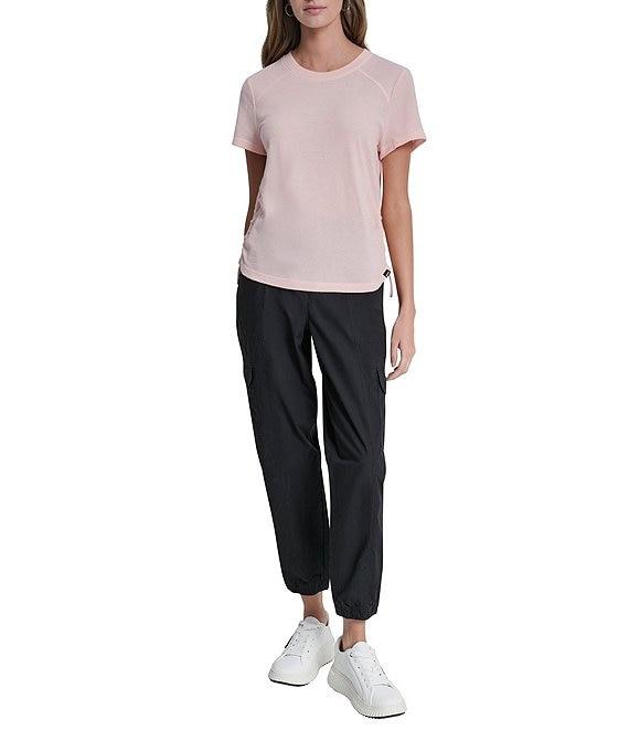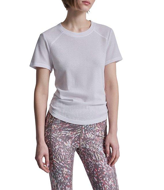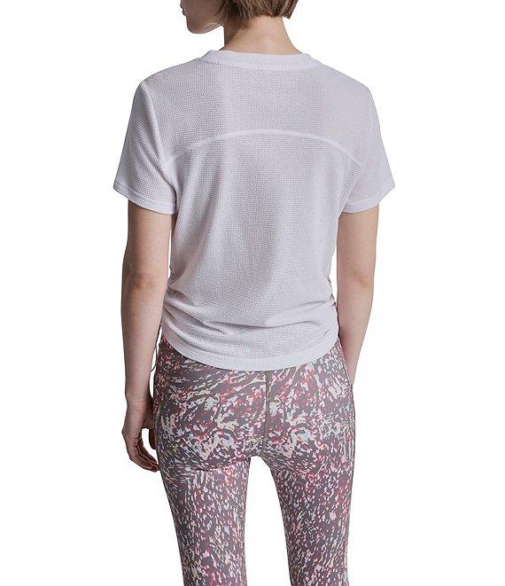 From DKNY Sport by Donna Karan, this tee features: Overtime mesh knit fabrication Crew neckline Short sleeves Seaming detail at the shoulders and back yoke Logo tab at wearer's left hem Adjustable elastic bungee with matte bungee stopper Pullover construction Approx. 23.5" length Cotton/polyester Machine wash cold Imported.