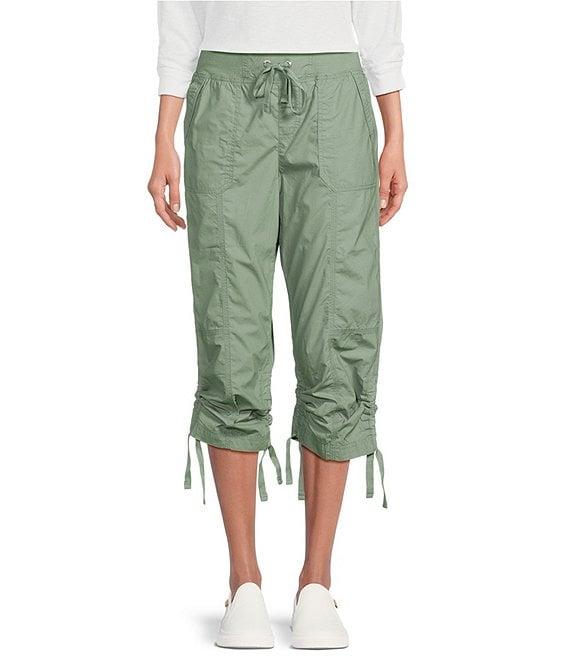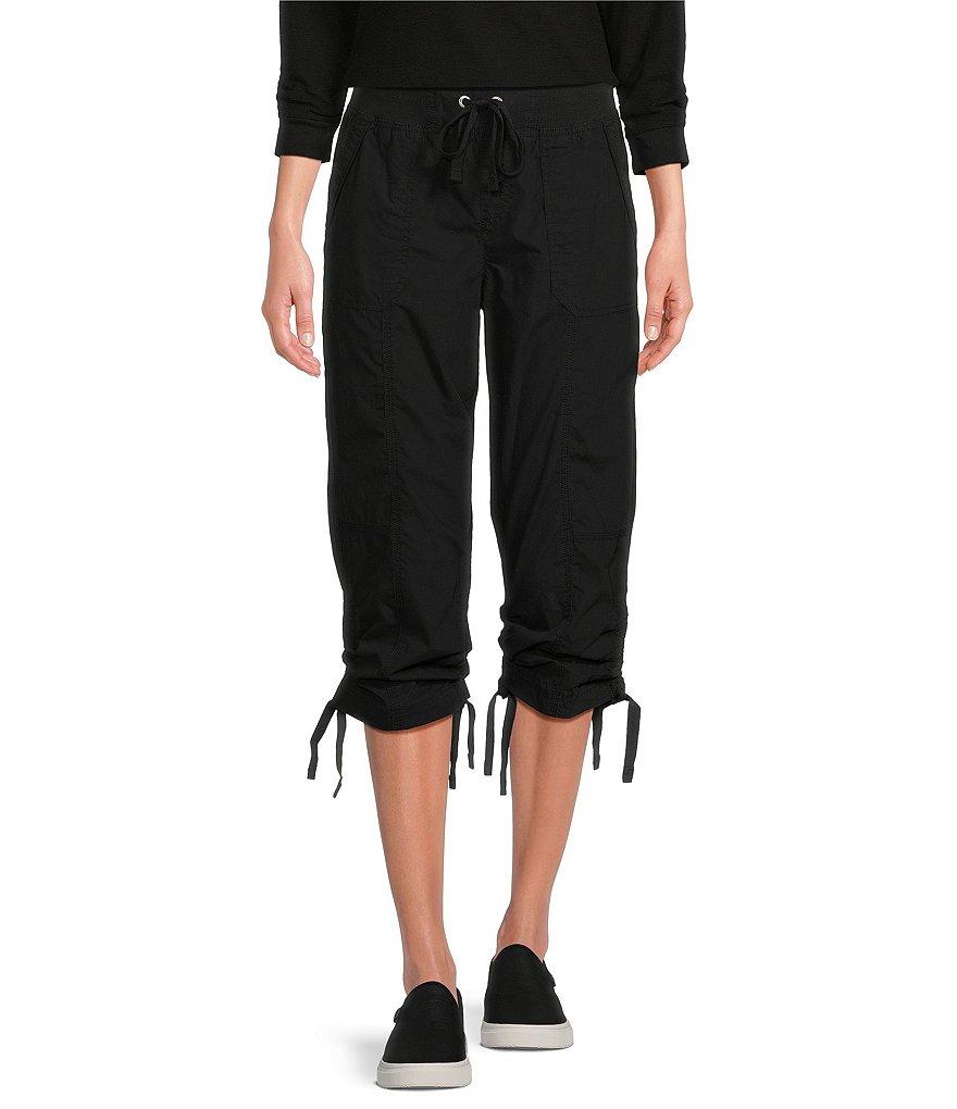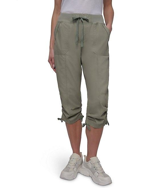 From DKNY Sport, this pant features:Peached poplin fabricationRibbed elastic drawstring waistbandCargo pocketsConvertible capri to cargo pantsSide cinchingPull-on constructionApprox. 20" inseam cinched; 22" uncinchedCottonMachine washImported.