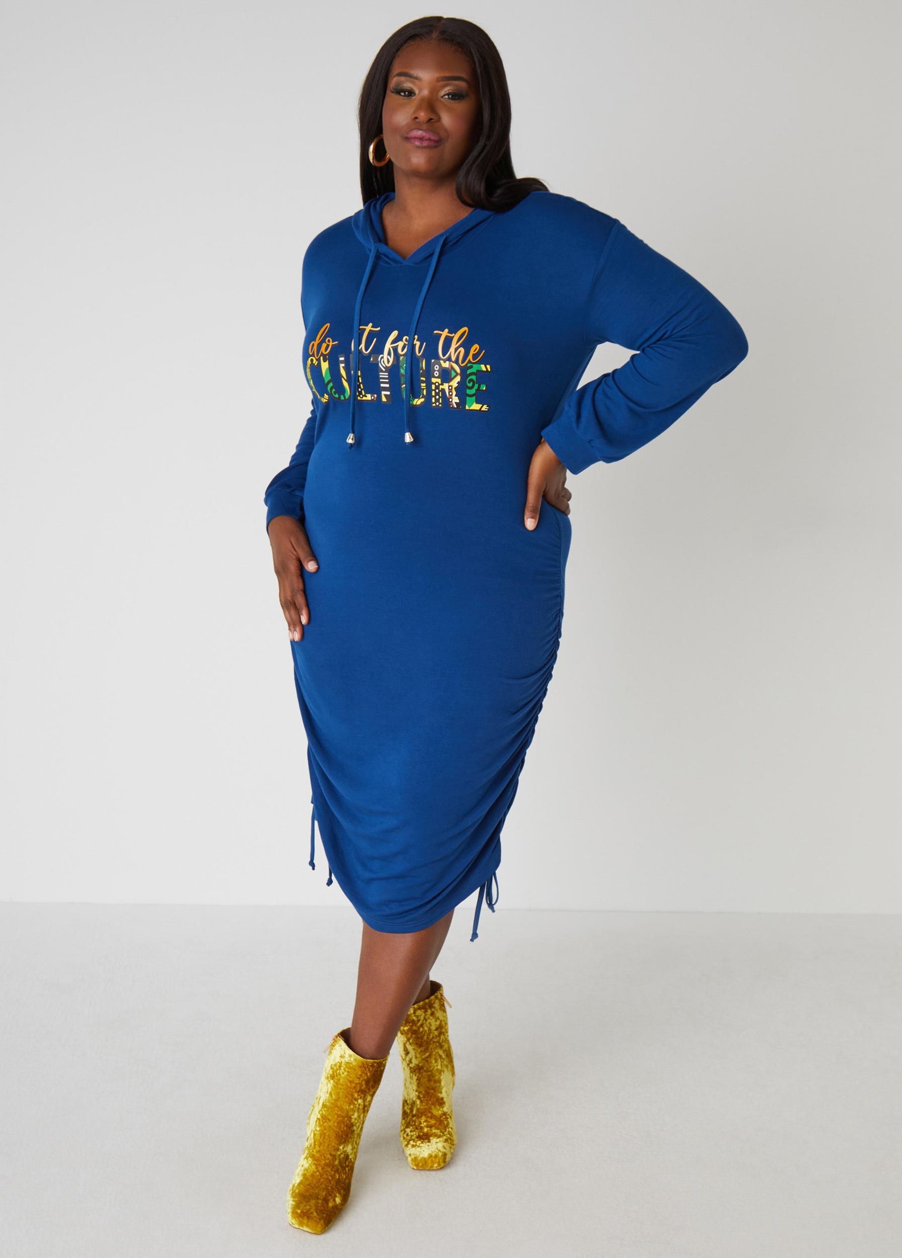 Show up and show out in the Do It For The Culture dress. This dress combines style with a casual aesthetic, featuring a standout graphic along the front. A drawstring hood offers laid-back comfort, while ruched detailing and faux drawstrings at the sides elevate the look with a touch of edge. Perfect for making a statement while keeping it cozy.