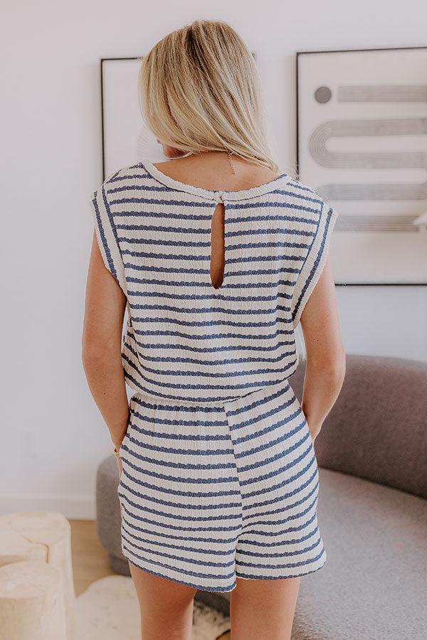 - Embrace sunny style made easy with this trendy striped romper! Perfect for breezy days and golden rays. - Unlined textured material with a striped design - A round neckline with back button closure and a keyhole detail - A sleeveless cut - An elastic waistline with a faux drawstring accent - Functional front pockets - A relaxed silhouette that ends in straight, upper-thigh length hemlines