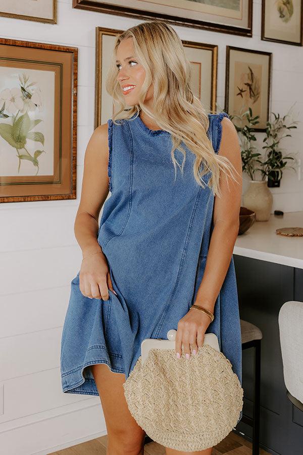 - Dockside days are calling with this trendy denim mini dress! The frayed edges add just the right touch of playful charm to keep things casual and cute. Perfect for everyday outings, brunches, or easygoing days at the lake house. - Unlined denim material - A round neckline with two tie details on the back for closure and frayed detailing - A sleeveless cut featuring frayed detailing - Functional side pockets - A relaxed silhouette that ends in a straight, mini dress length hemline