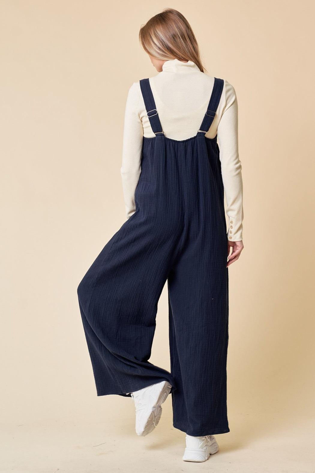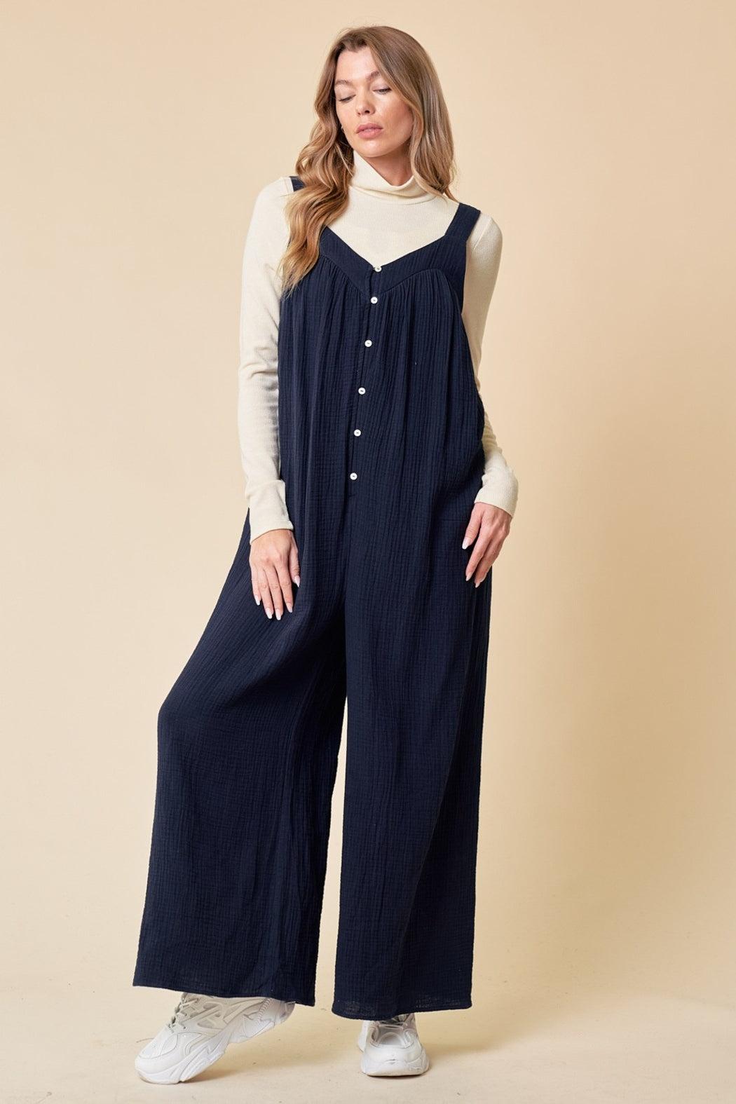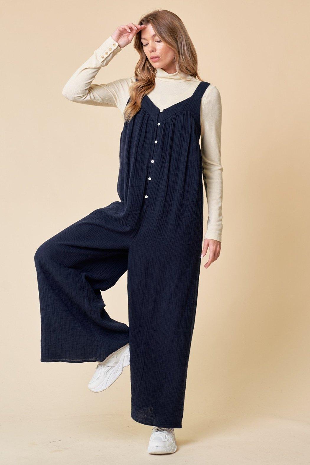 Effortlessly relaxed and endlessly versatile, this Double Cotton Gauze Jumpsuit is your go-to for breezy, laid-back style. Crafted from soft, breathable cotton gauze, it features a flattering wide-leg silhouette and functional front button detailing for an added touch of charm. Thick shoulder straps offer comfort and support, while the flowy fit makes it perfect for layering over tees or turtlenecks. Whether you're lounging at home or heading out in style, this jumpsuit blends comfort with effortless chic.