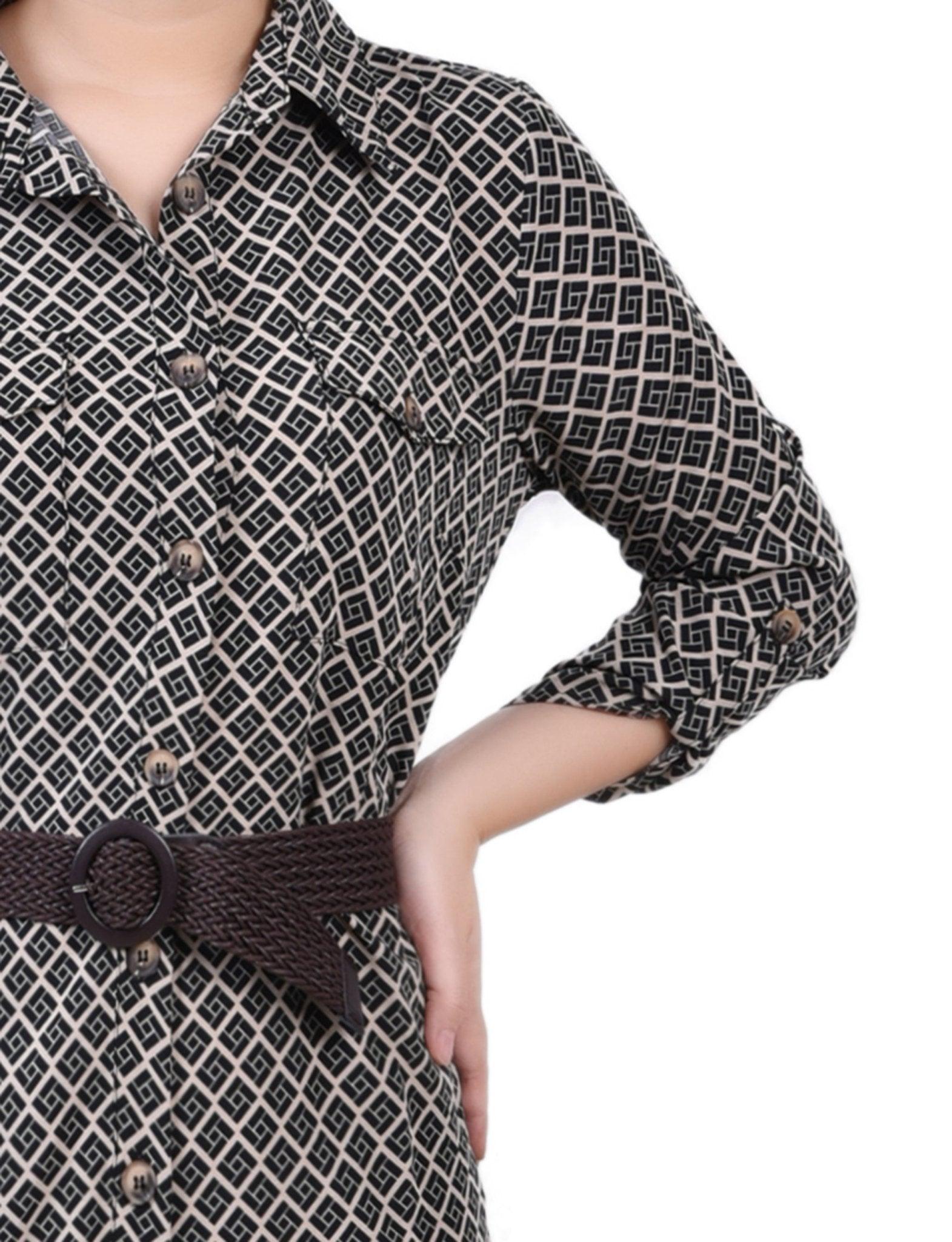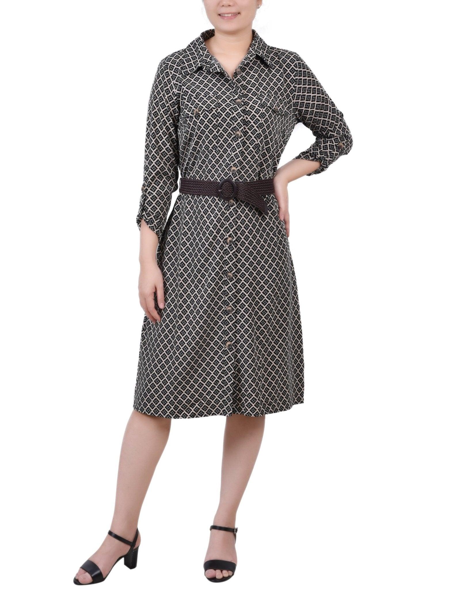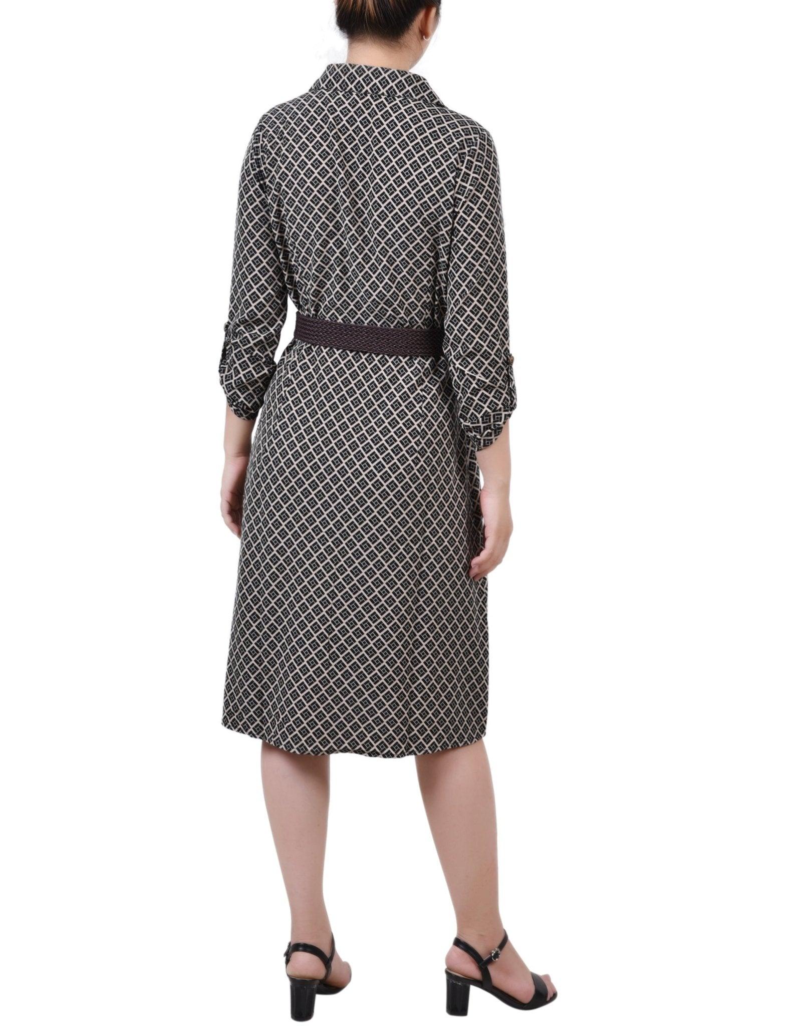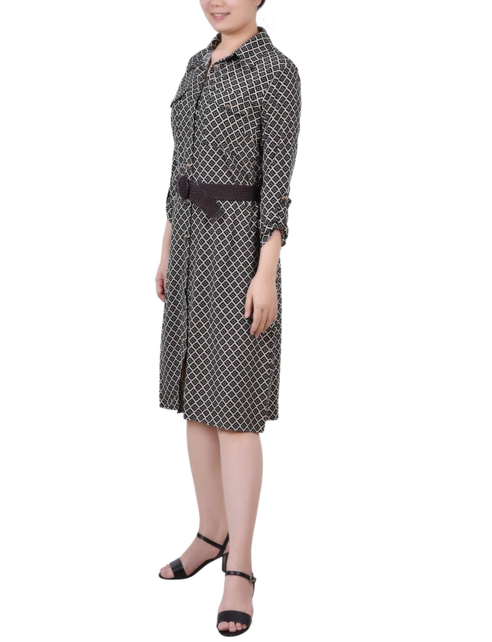 Black Doeskin Geo 3/4 Roll Tab Sleeve Belted Shirtdress - Petite