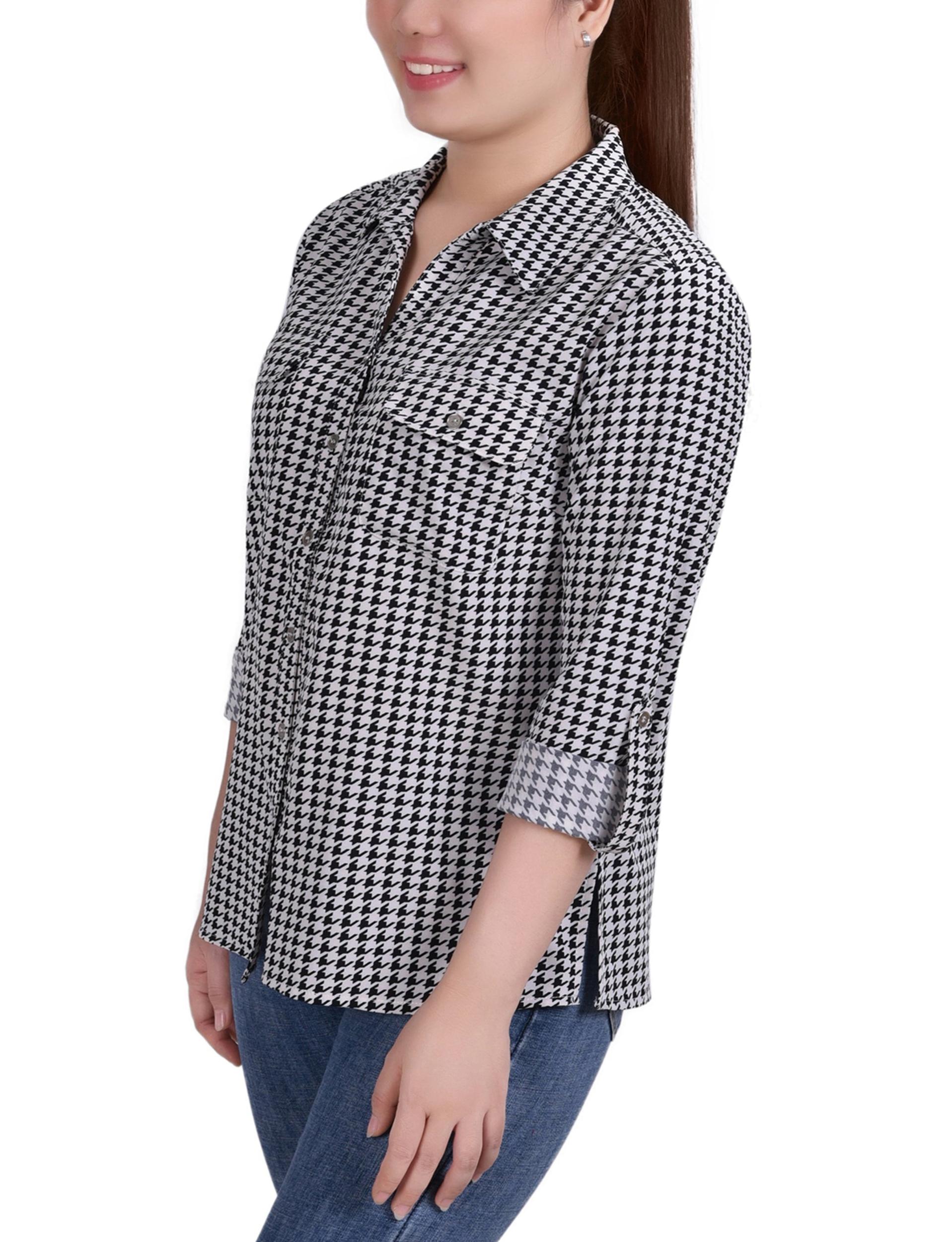 Doeskin W Black Herringbone 3/4 Roll Tab Blouse With Pockets - Petite