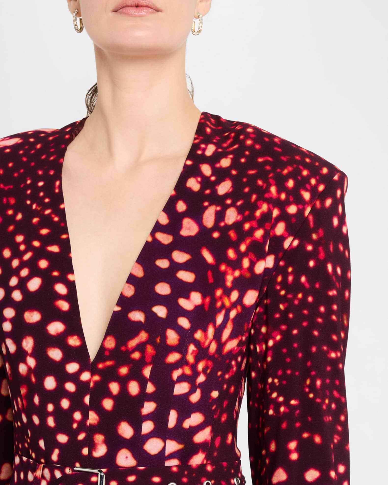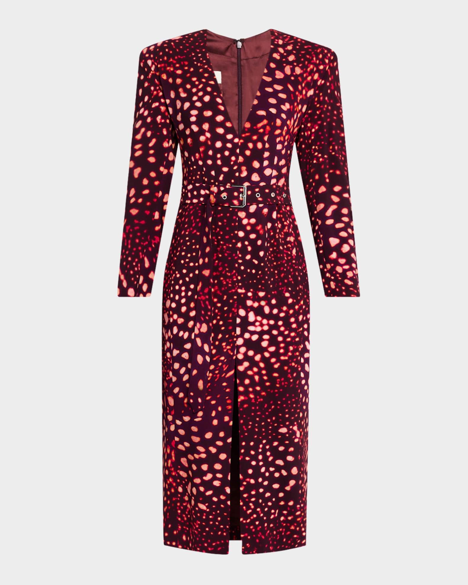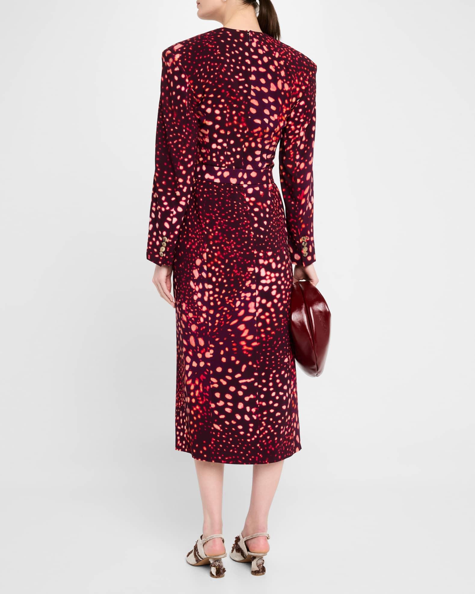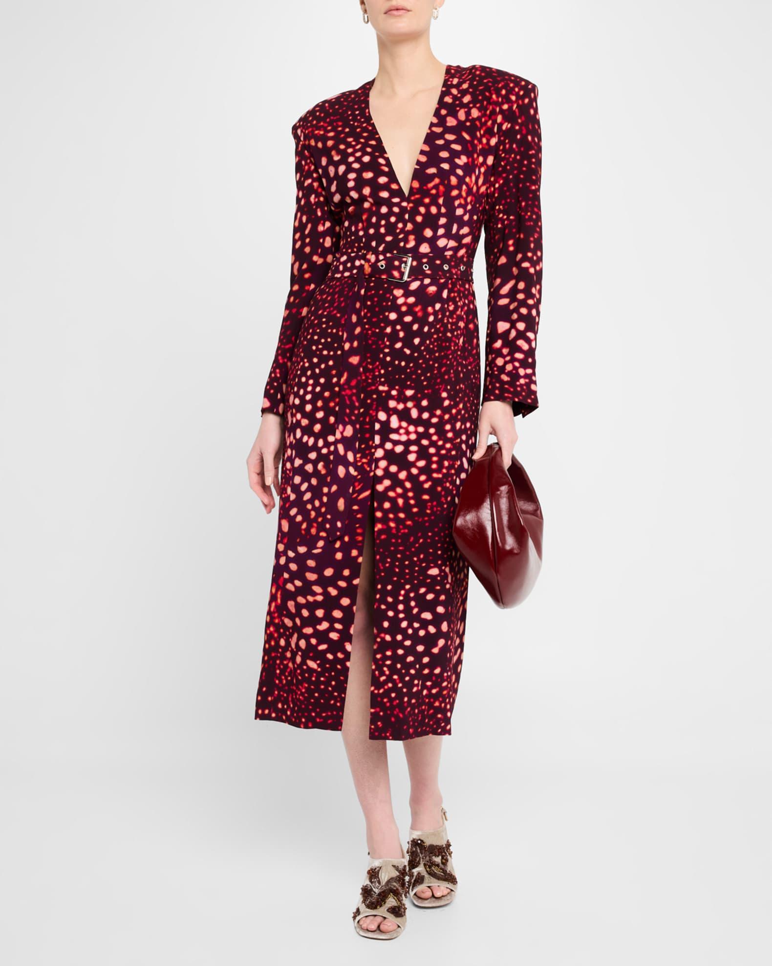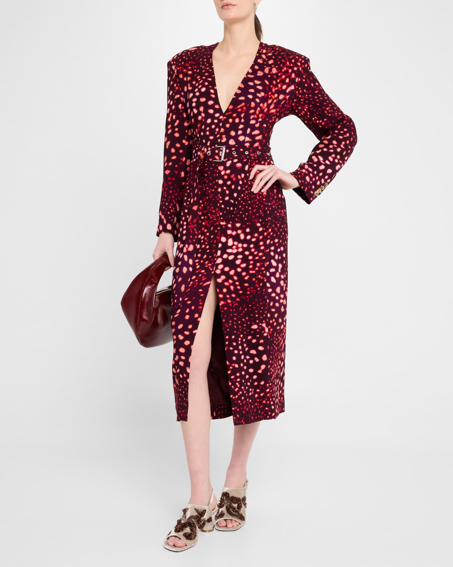 Dries Van Noten "Dohana" crepe dress in spot print V neckline Long sleeves; button cuffs Belted waist Midi length Sheath silhouette Front walking vent Back zip Viscose Made in Poland