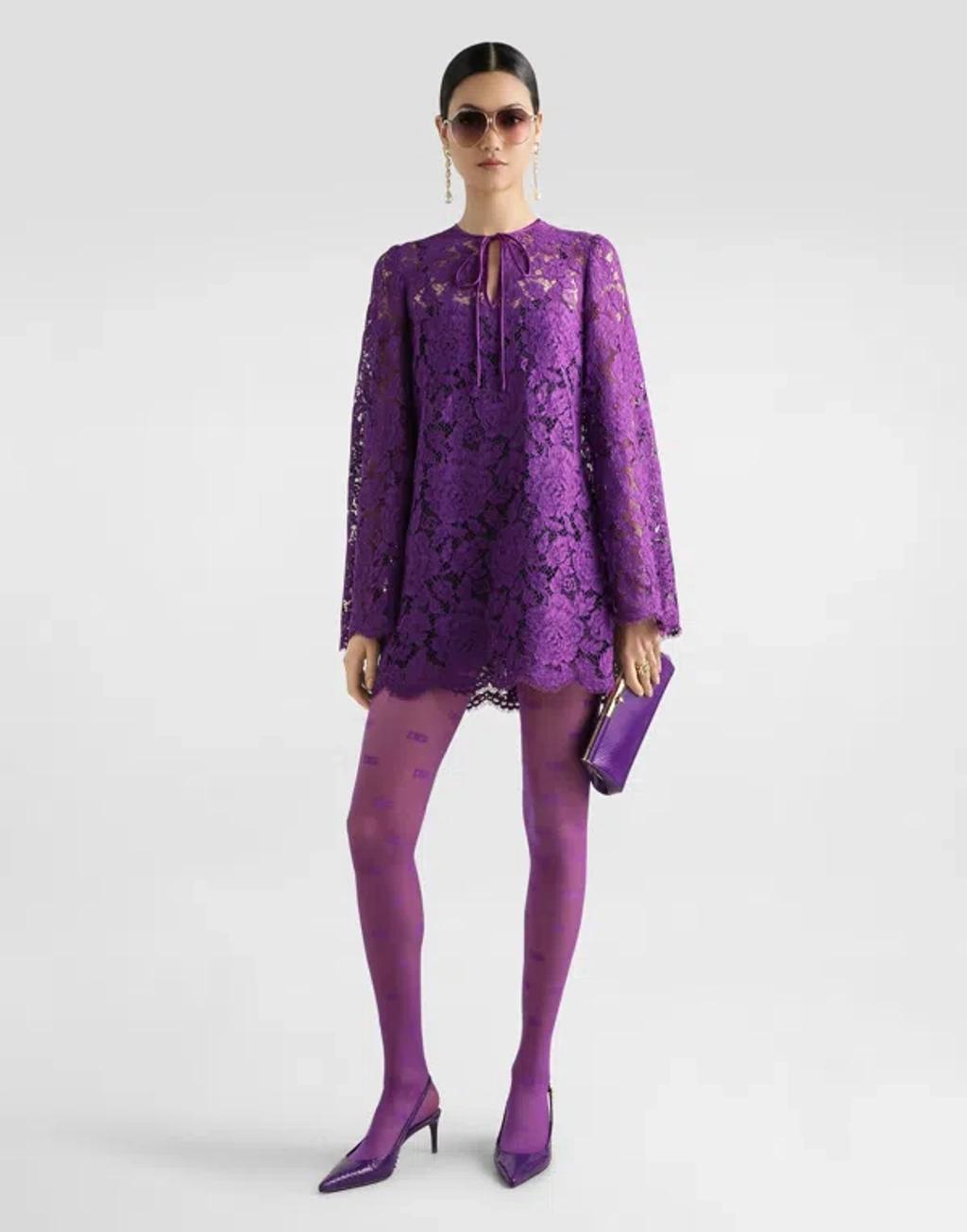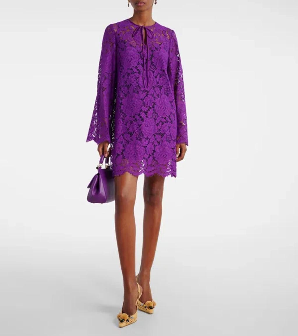 Shop Dolce & Gabbana Cordonetto Lace Short Dress In Purple from 800+ stores, starting at $1707. Dress. Violet. Round neck. Bow detail on the neck. Long sleeves. Rear zip closure. Scallop hem. All-over floral embroidery. Cotton blend. Regular fit. Gender: Women. Material: 33% COTTON 22% POLYAMIDE 10% SILK 35% VISCOSE. Color: Purple. Made in: IT. Product ID: F6DJOTHLM7LF0571. *Import tax/duty will be calculated at checkout (If applicable)