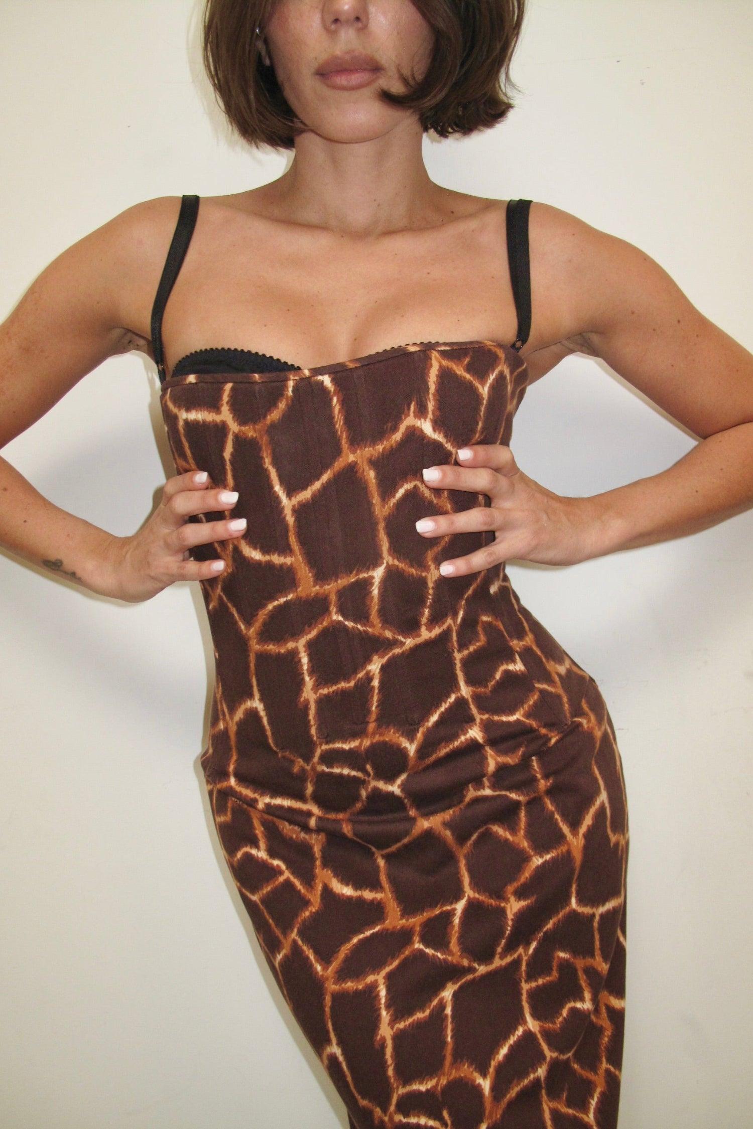 This Dolce & Gabbana midi-length spaghetti strap dress comes in a giraffe print that hugs in all the right places due to its corsetted structure and under bra detal in black. Size 40.