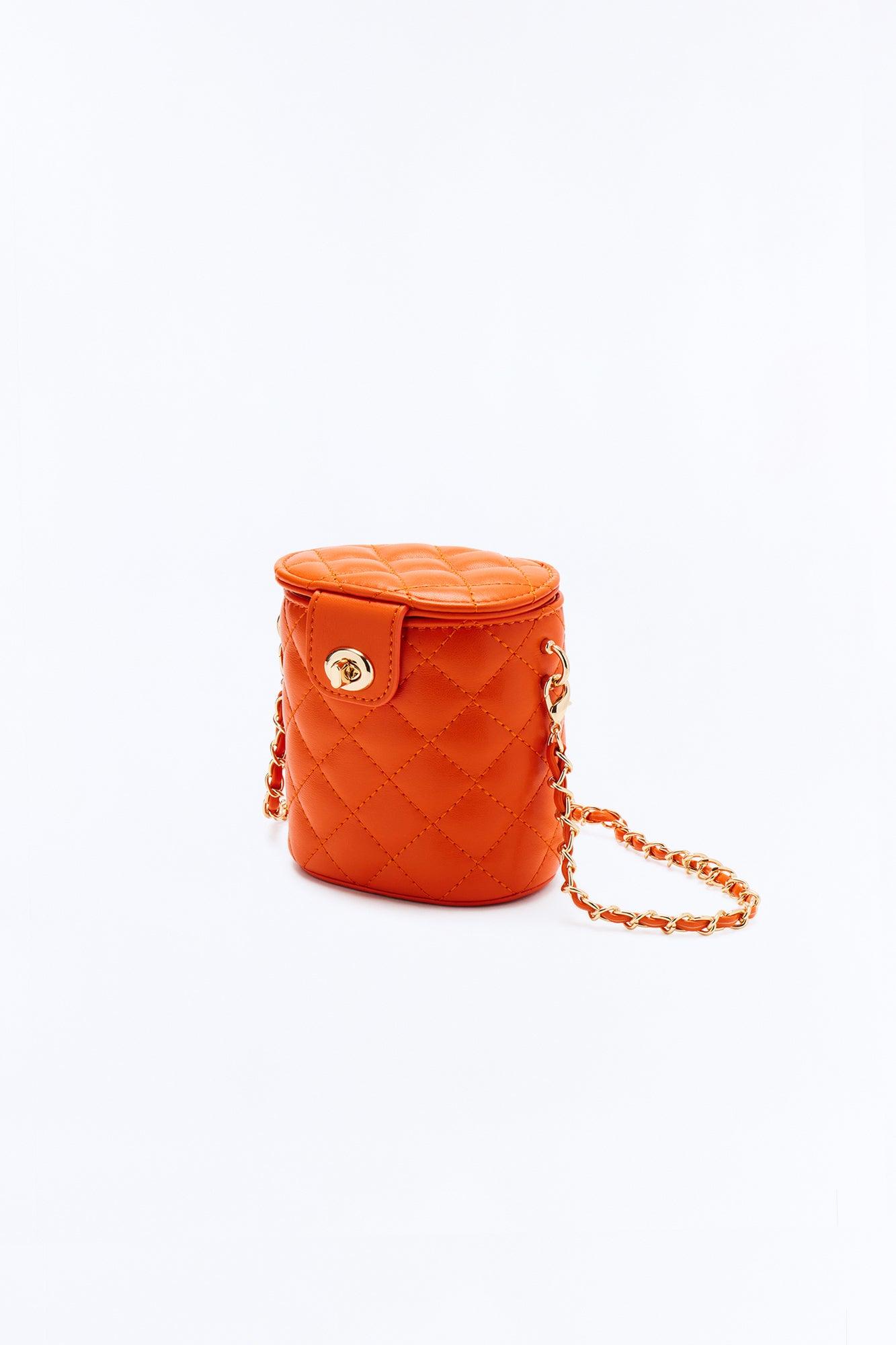 Available In Brown And Orange. Mini Bucket Clutch Bag Foldover Turn Lock Closure Faux Leather Material Quilted Pattern Chain Handle Satin Scarf Detail Dimensions: 3.25"5.25"3.25 Imported California Proposition 65WARNING: Cancer and Reproductive Harm - www.P65Warnings.ca.gov.