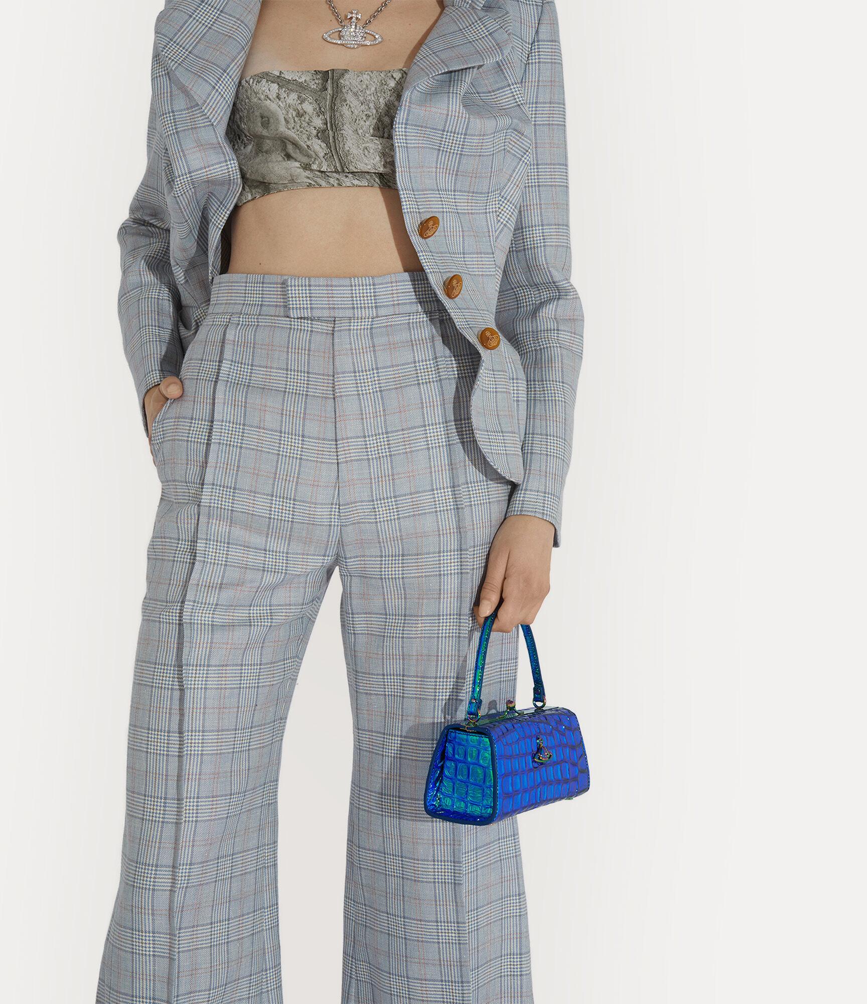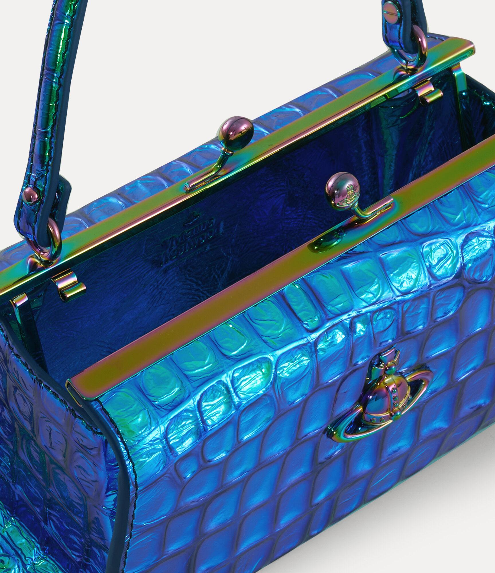 The silhouette of the Doll XL bag takes inspiration from Victorian doll bags, as an ode to the imaginary, featuring an intricately engraved kiss-lock closure and an iridescent orb motif at the centre. The style is offered in a croc-effect embossed finish, complete with a top-handle design.