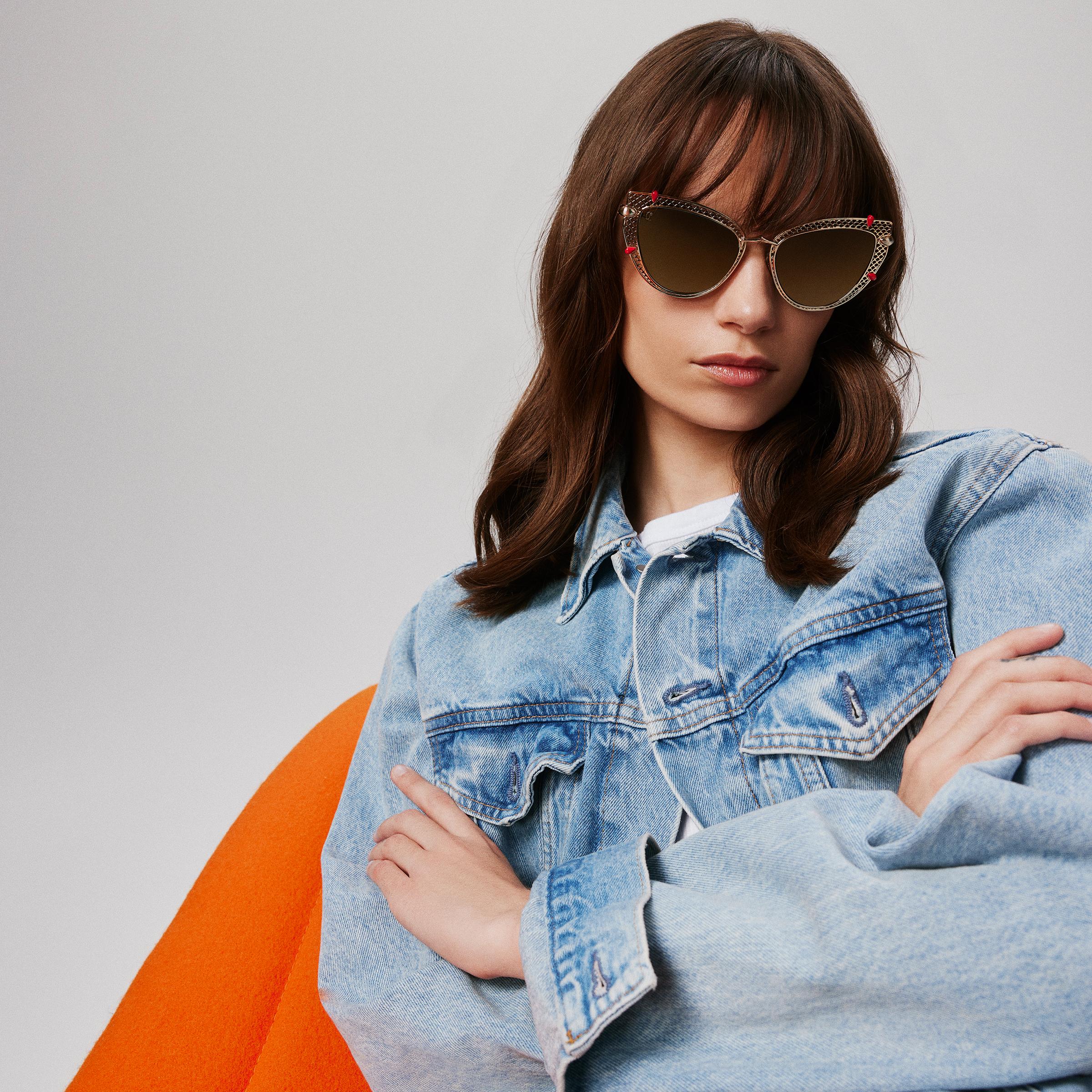 Dolly LB0002 is one of the most iconic styles of this sunglasses collection. It features a cat-eye shape with palmette pattern crafted metal on the frontal grabbed by tiny red sole signifier. Art deco inspired metal temples with palm detail on the hinge. This model is made in pale gold color with smoke gold mirrored lenses. High-performance Zeiss lenses offering exceptional quality comfort and durability for Christian Louboutin collection.The design draws inspiration from the shapes of Art Deco, reflected in the uniquely pointed bridge and in the palmette pattern of the front and palm detail on the hinge.The frame is a tribute to lightness, embodying a new level of femininity and grace. Each curve and contour reflects an elegance that is subtle yet powerful, capturing the essence of refined beauty.This design harmoniously blends artistic sophistication with a gentle, airy presence, offering a timeless elegance that resonates with those who appreciate the finer things in life. These frames are suitable to add prescription lenses. Made in Italy.