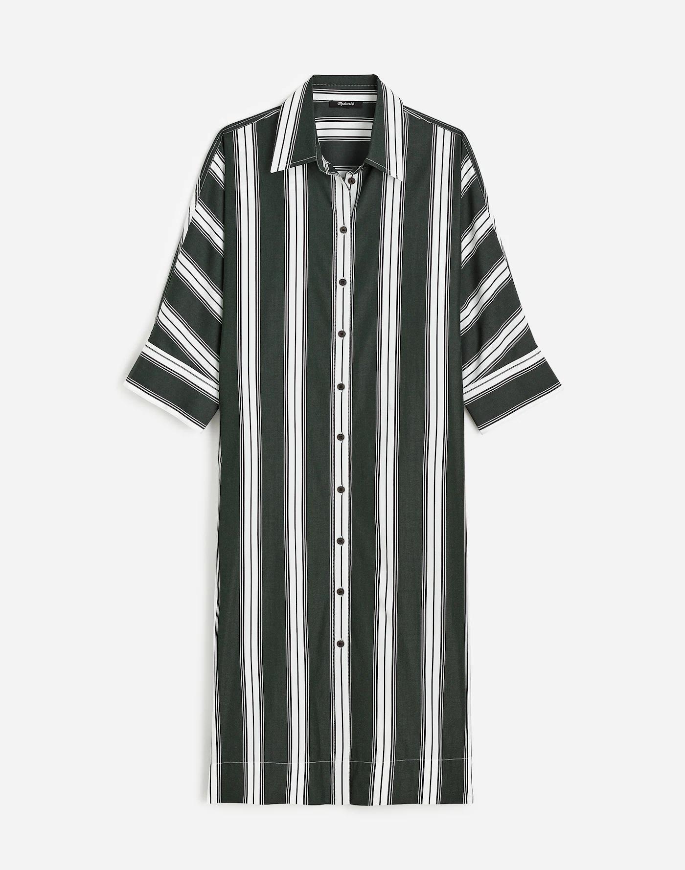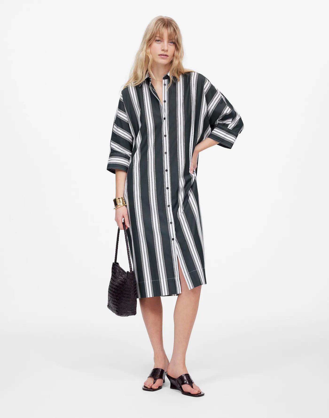 Elevate your everyday wardrobe with this midi shirtdress in bold striped cotton poplin. The classic shirt placket down the front create a timeless look, while the three-quarter wide dolman sleeves and side slit add an effortless, modern twist.