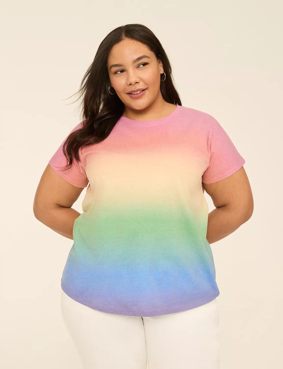 Available in Plus Size A so-soft tee in rainbow ombre - perfect to show your Pride all year round. FIT: Classic. Designed for curves and a not-too-tight, not-too-loose, just-right fit. Front Body Length From Shoulder: 31 (On Size 18) Longer length is perfect for added coverage. FEATURES: Scoop-neck Short dolman sleeves Curved hem SPECIAL NOTE: Unique tie dye coloration may vary on each garment FABRIC: Soft, breathable jersey knit Machine Wash 60% Cotton, 40% Polyester Item Number #411725 Import