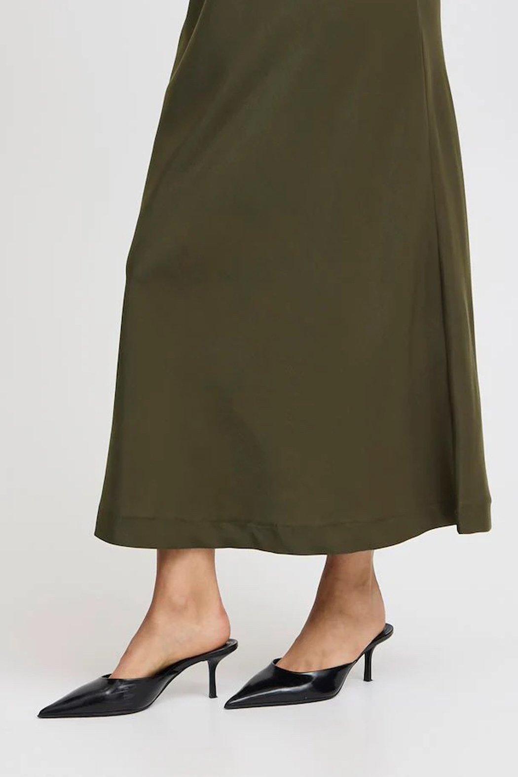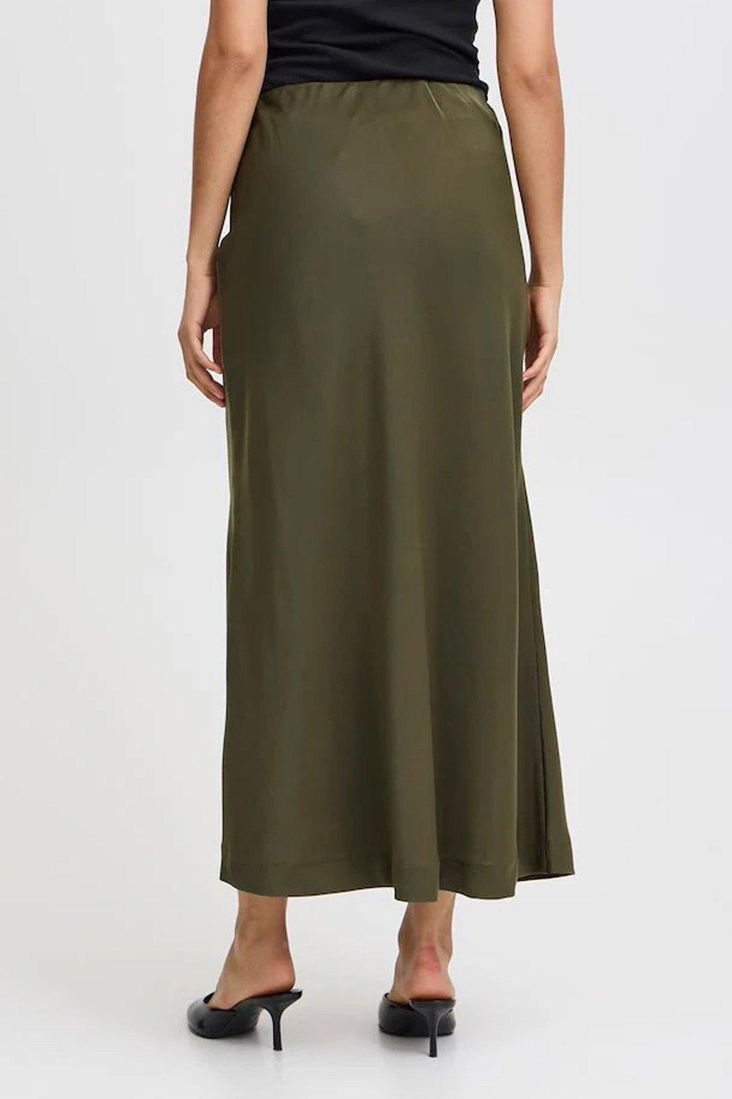 In a rich olive green, this bias cut satin maxi skirt features a flat elastic waistband for comfort and ease of wear. Pair with a chunky cream sweater and tall boots for a classic on trend look.