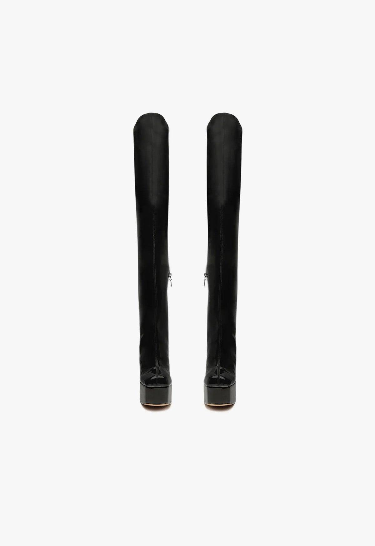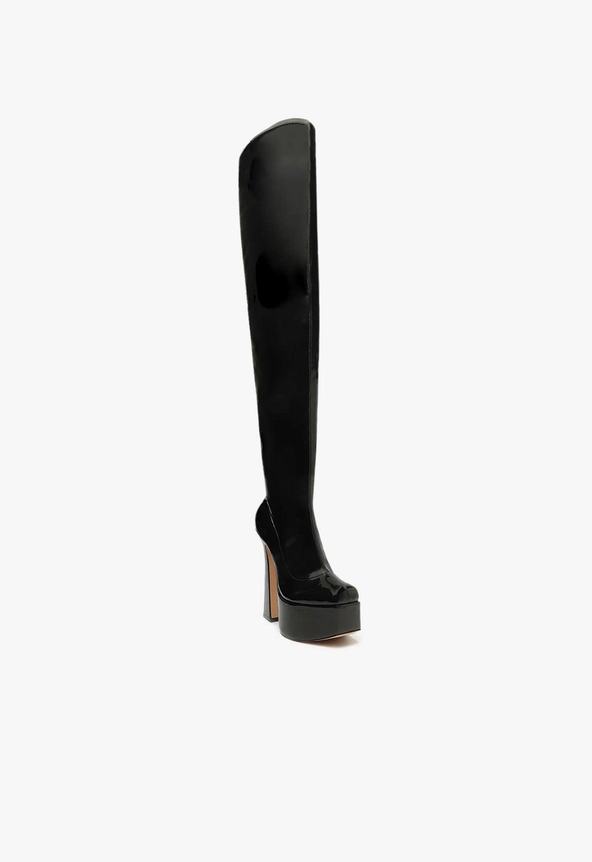 Take your look to new heights in the Dolores Boot, featuring a platform and chunky heel.Materials: Faux Patent Leather | Cow leather lining | Cow leather outsoleUpper format: SkinnyHeel Type: High HeelHeel Style: BlockClosure Type: Slip-onToe Style: Square toeCounter Type: ClosedShaft Circumference: 17.6in | 440mmShaft Height: 26.8in | 670mmPlatform Height: 50mmHeel Height: 5.7in | 145mmRubber patch at the heel.SKU: S2153400020001