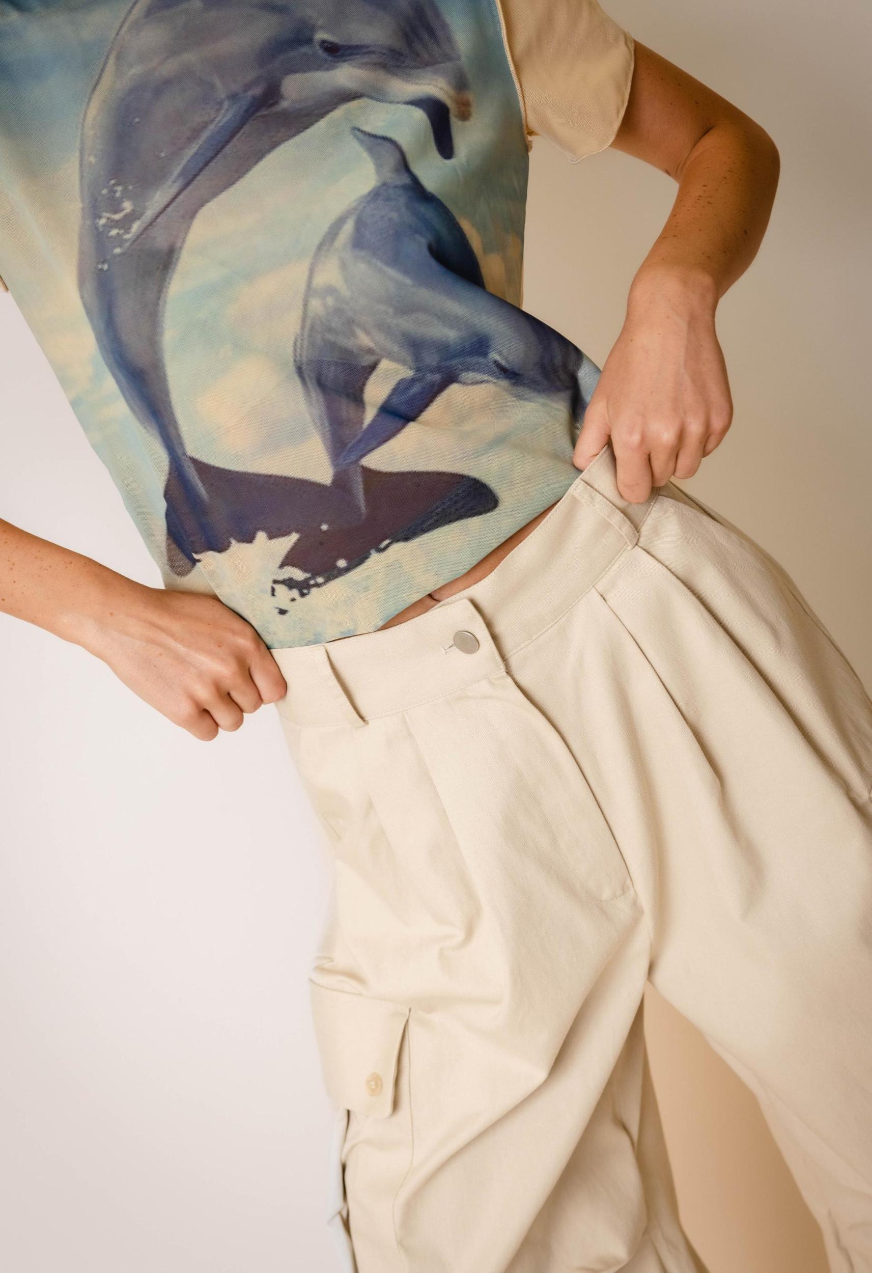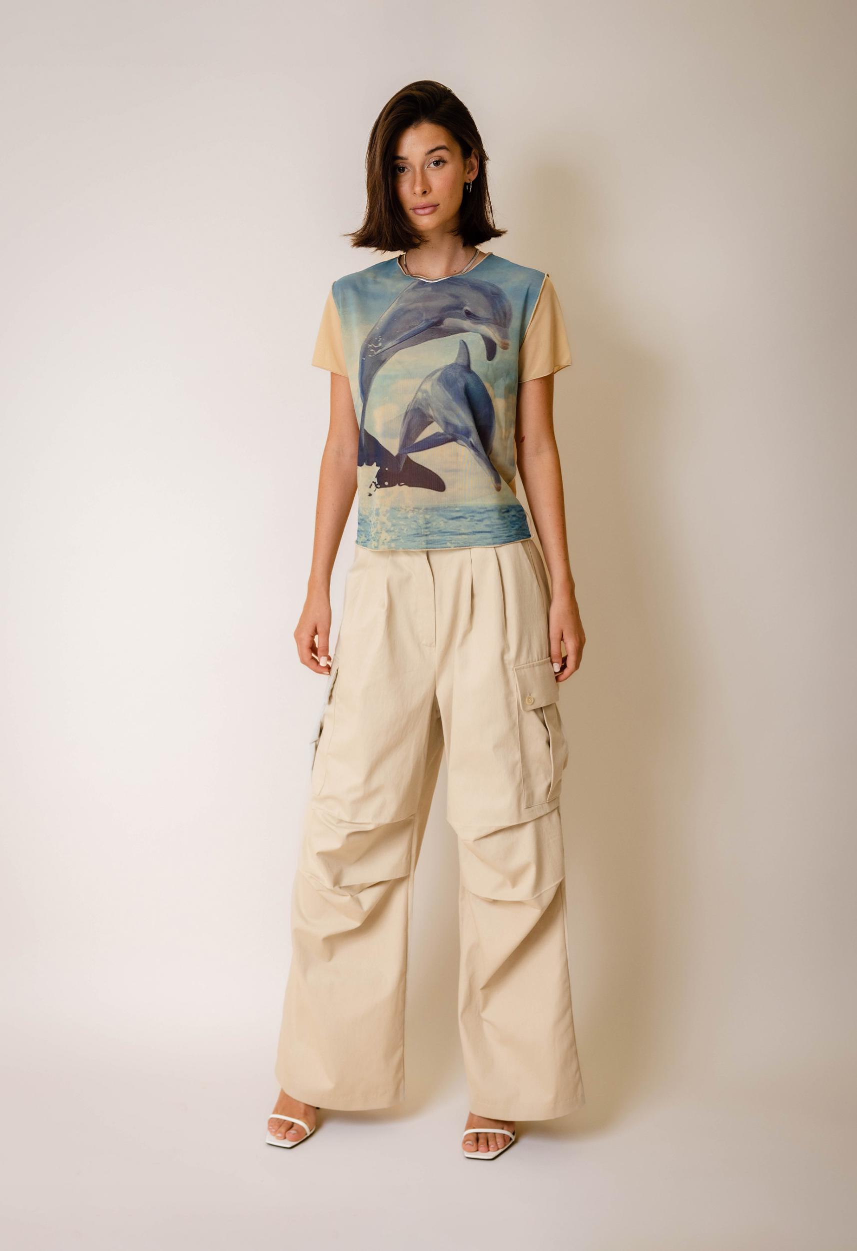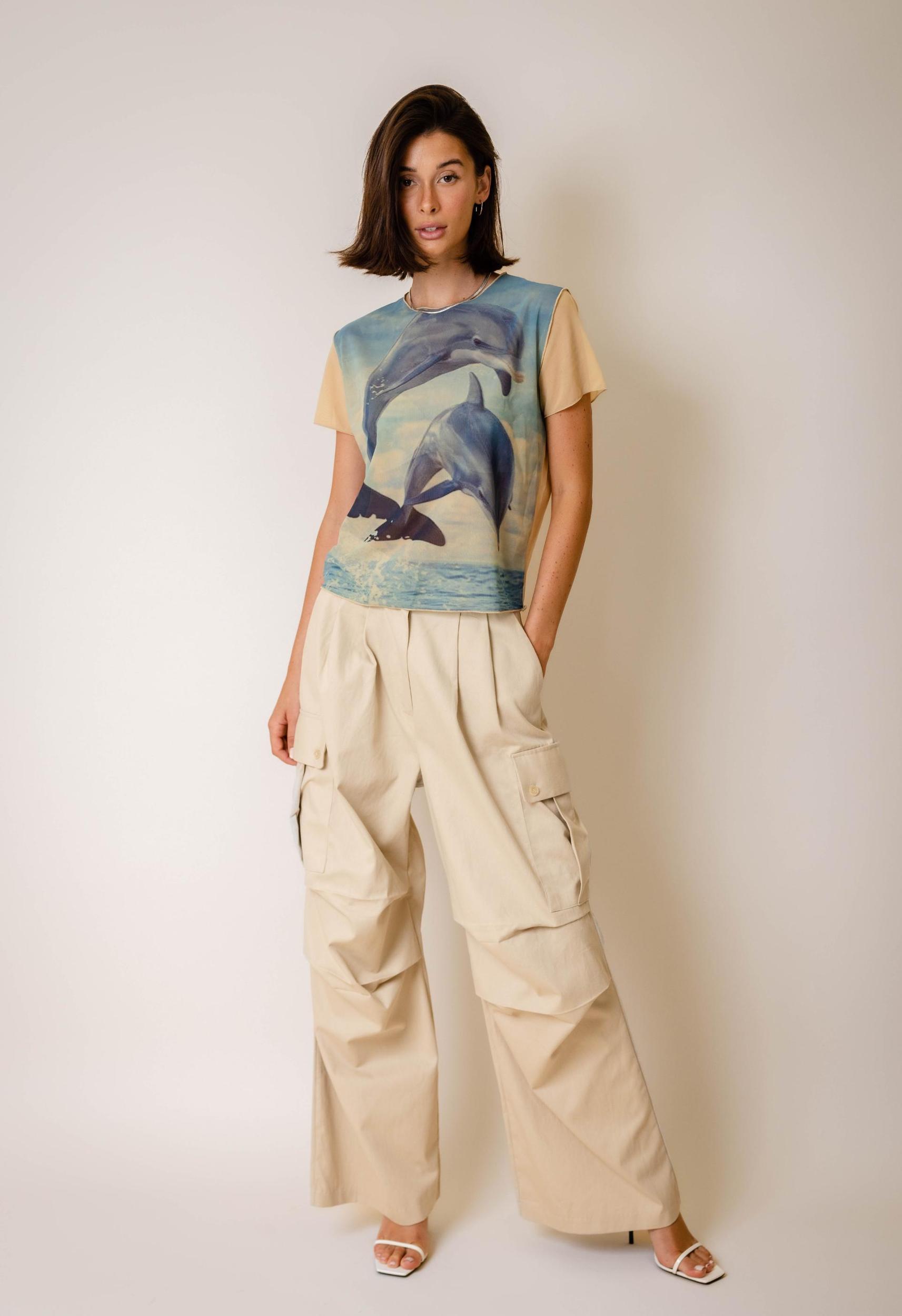 One size. Fits XS-M Color: Blue and Tan Lightweight mesh fabric Dolphin print on front side Short sleeve 95% Polyester, 5% Nylon Dry Clean By The NKC StoreProduct Measurements: Bust: 91.44cm / 36in Length: 53.34cm / 21inModel is 177cm / 5'10" wearing Size O/S